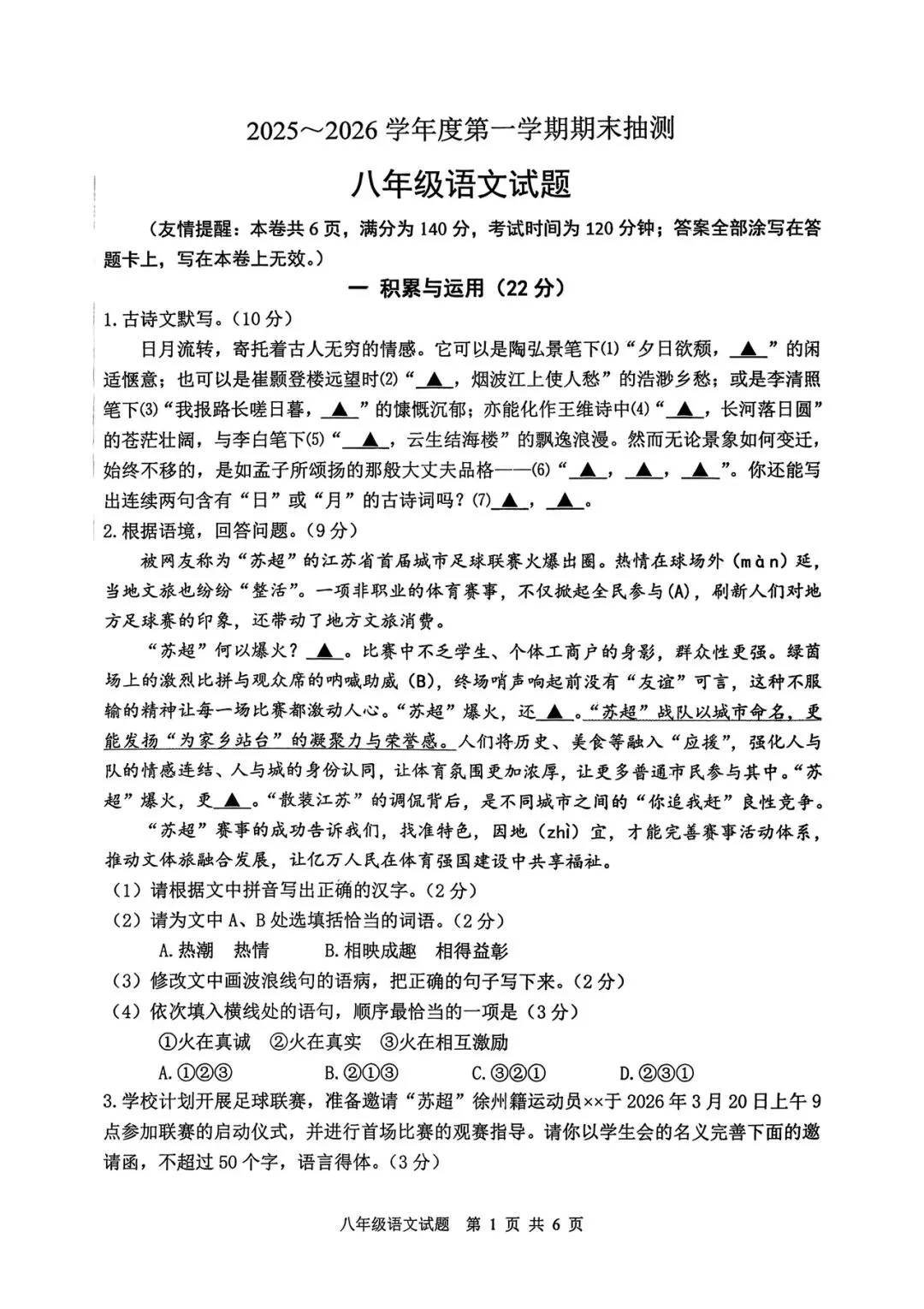 江苏省徐州市2025—2026学年度第一学期期末抽测八年级语文试题