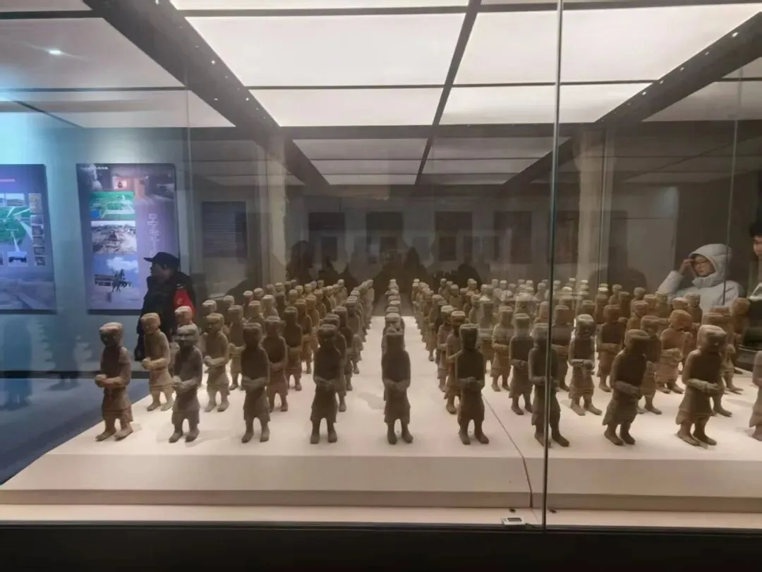 在汉兵马俑展区,我们驻足凝视那排列整齐的陶俑军阵。与秦始皇陵兵马俑的高大威猛不同,徐州汉俑体型小巧却神态各异,梳着发髻的士兵俑、戴着头盔的军吏俑、身姿矫健的骑兵俑,或肃穆挺立,或神情昂扬,甚至有嘴角微扬、透着自信的陶俑,将楚文化的浪漫特质与汉代军阵的威严气势展现得淋漓尽致。小队成员们不时俯身观察,仔细记录陶俑的铠甲纹路、面部表情,惊叹于古人精湛的雕刻技艺,更从这四千余件陶俑中,读懂了西汉早期楚国军队的编制与战力,体会到楚汉时期的军事文化魅力。据悉,这些汉俑于1984年被意外发现,经过考古工作者的抢救性发掘,才得以揭开这座地下军阵的神秘面纱。