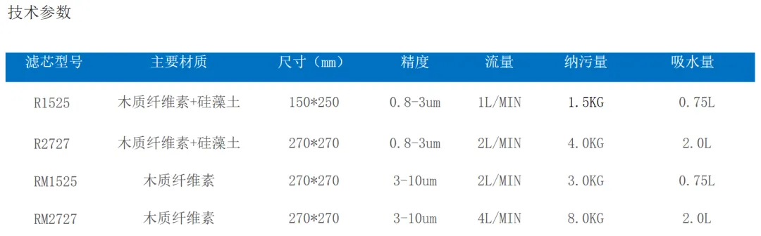 R系列滤芯采用木质纤维素和硅藻土作为主要过滤材料, 具有高精度、高吸附性。