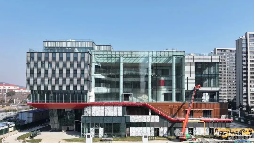 目前,“几方”二字已跃然于建筑外立面,独特的红、白、金等多色几何拼接幕墙,营造出兼具现代感与艺术感的视觉形象。
