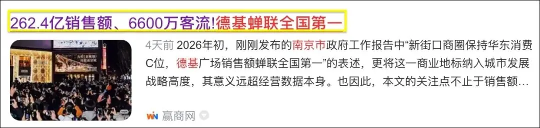 2025年南京德基广场全年实现销售额262.4亿元,同比增长7.1%,总客流量突破6600万人次,蝉联全国第一!