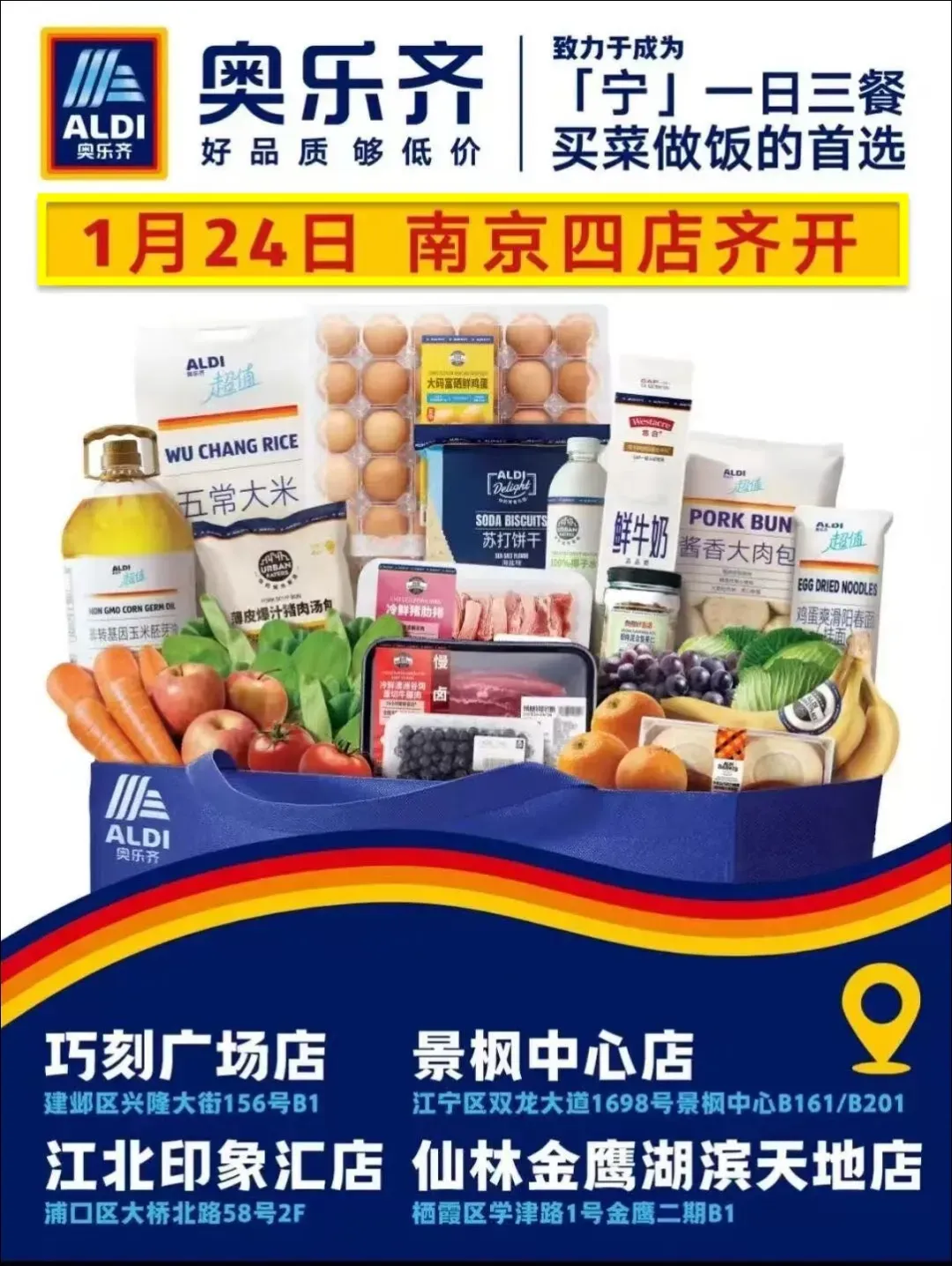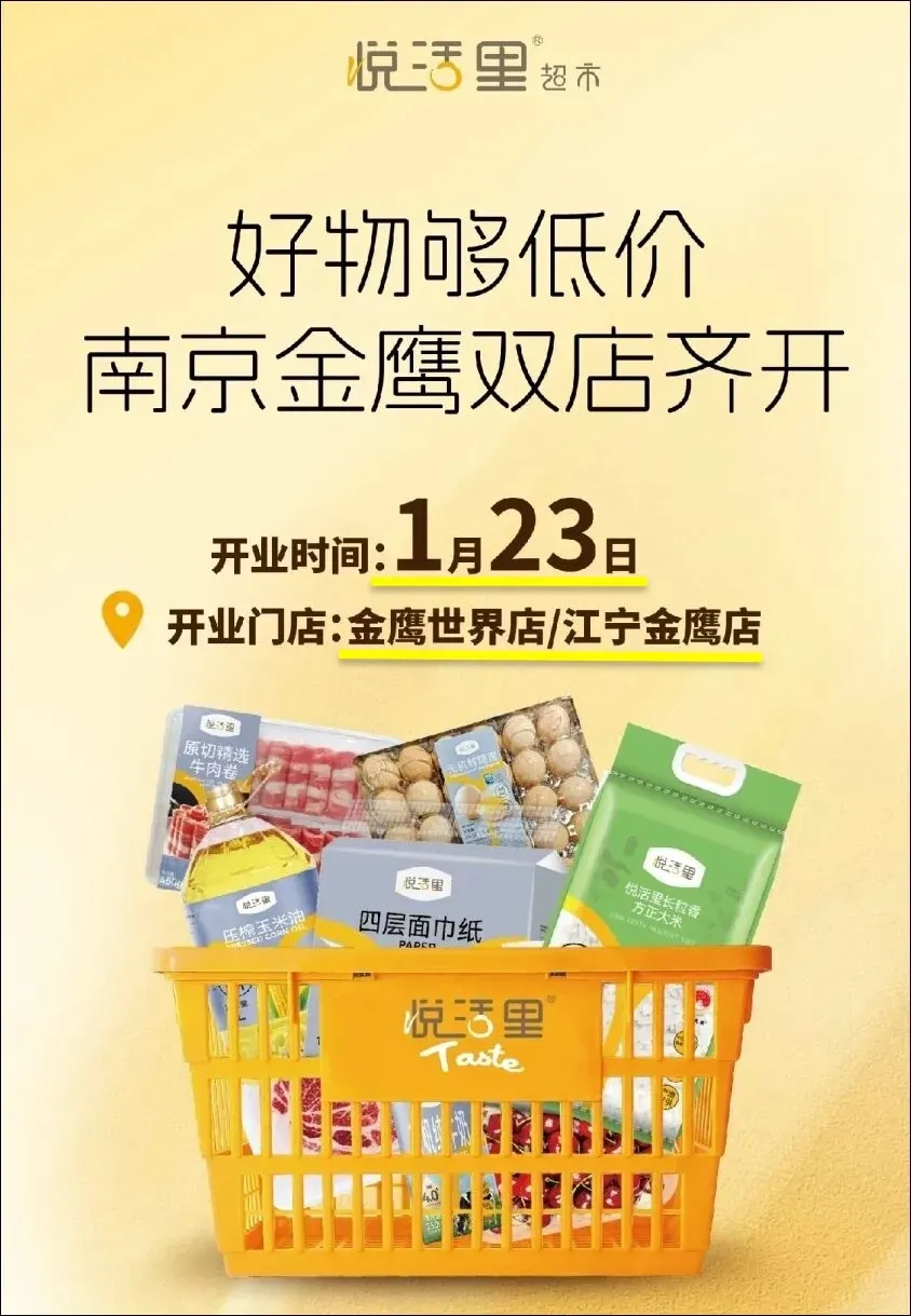 1月23日,河西金鹰世界、江宁金鹰2家悦活里超市同步开业。1月24日,河西巧刻广场、江宁景枫、江北印象汇、仙林金鹰4家奥乐齐超市同步开业。3、江北印象汇,升级重新开业