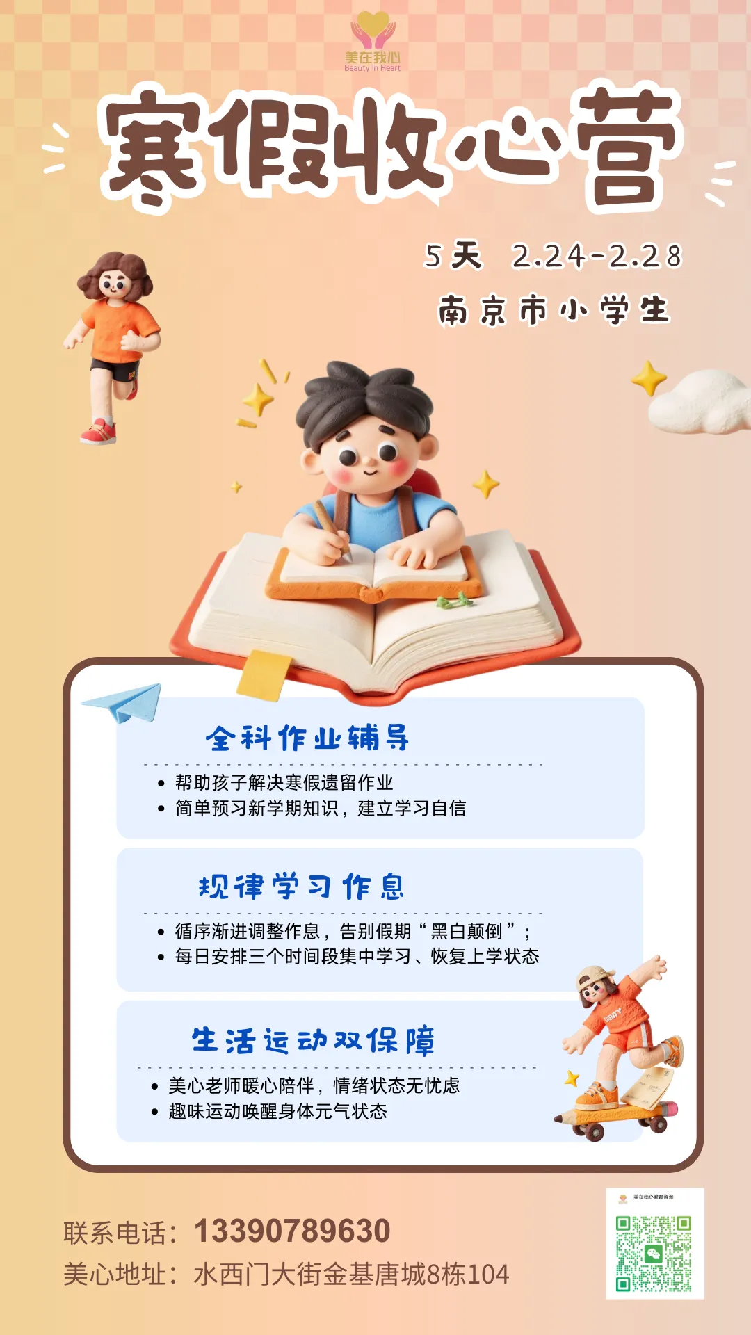 美心扎根南京亲子成长领域多年,我们以温暖守护代替冰冷教育,特提前为小学生定制「2.24-2.28节后收心营」。安排好节后收心营,春节只管带娃尽情玩耍,节后的作业辅导、状态回归、体能恢复等问题,交给美心老师就好啦,让娃平稳衔接开学,家长安心投入工作!