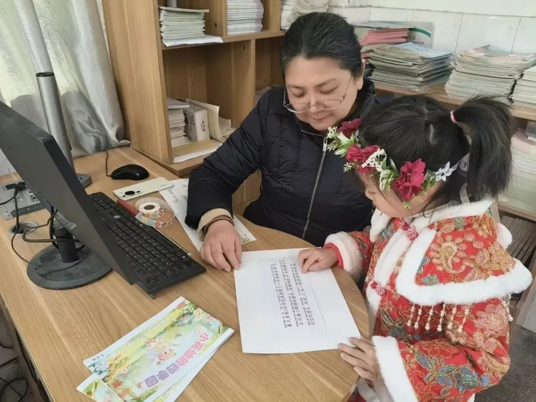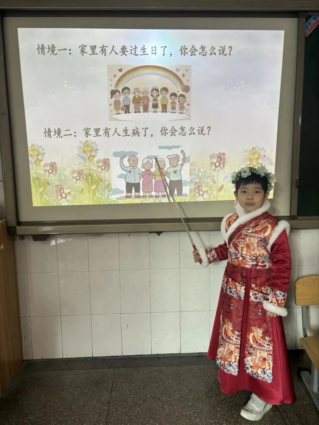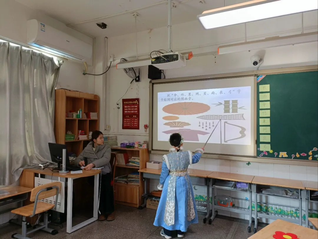 孩子们手持“萌芽魔法棒”,走进绿意盎然的“春之园”。在“诵读花屋”中,他们用稚嫩而清晰的声音朗读拼音段落,唤醒沉睡的“拼音种子”。随后抽取“花签”,背诵课文与古诗,童声朗朗,如春风拂过花枝,展现了一学期语言积累的扎实与灵动。