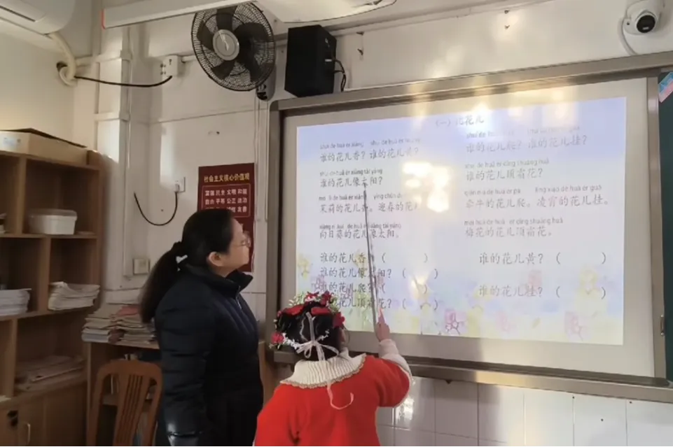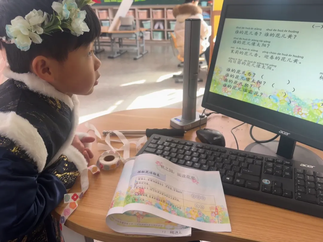 “悦读花廊”中悬挂着各类“花语绘本”,孩子们借助拼音自主阅读童谣与短文,并化身“信息小侦探”,回答文后问题。从《花婆婆》片段到四季儿歌,孩子们在图文共读中锻炼提取信息、理解文意的能力,阅读兴趣与思维力悄然生长。