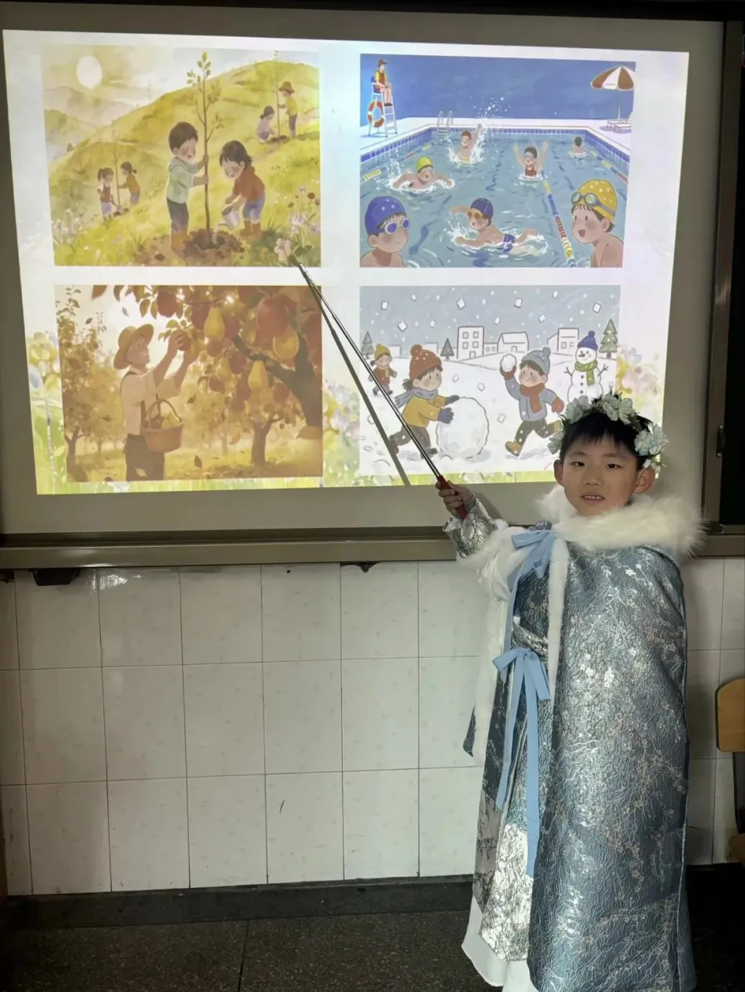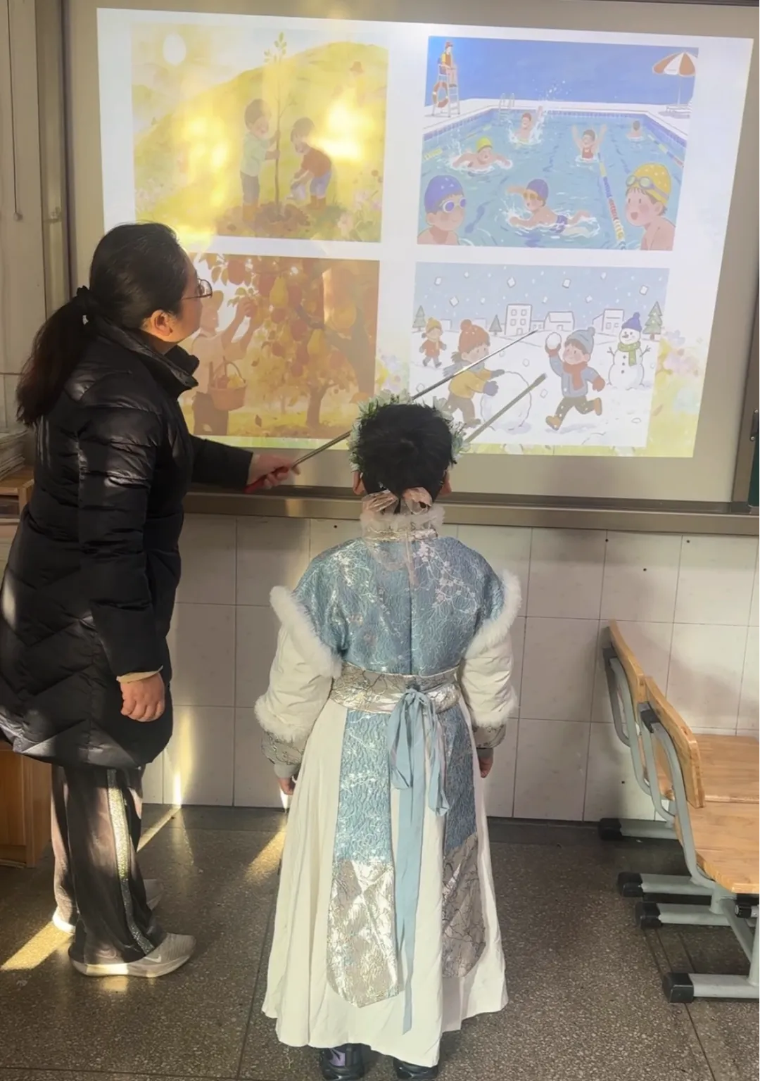 在飘着“雪花”的“冬之园”里,孩子们从“魔法相册”中选择喜爱的季节图画,用连贯的语言讲述画面故事,并向老师、同学送上真诚的节日祝福。他们落落大方、表达清晰,在真实语境中锻炼了口语交际与情感表达能力。