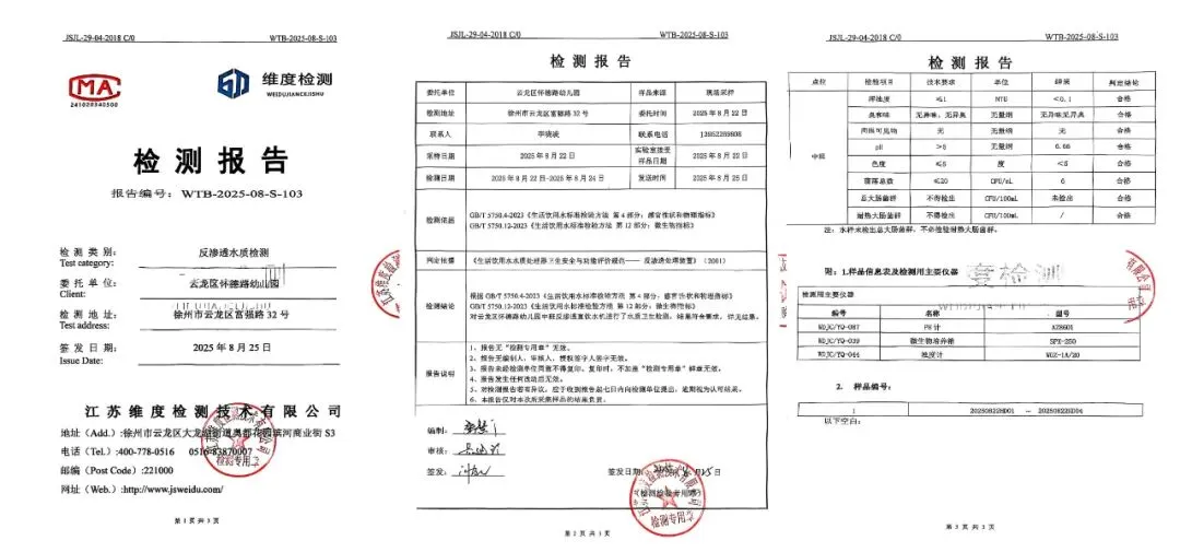 水是生命之源,关系到每个幼儿的健康。新学期,万象更新,我园为保障全园师幼喝上放心水、健康水,助力秋季开学顺利进行,2025年8月28日,我园联系专业机构对幼儿园饮用净水和生活用水进行抽样检测,确保饮用水安全。