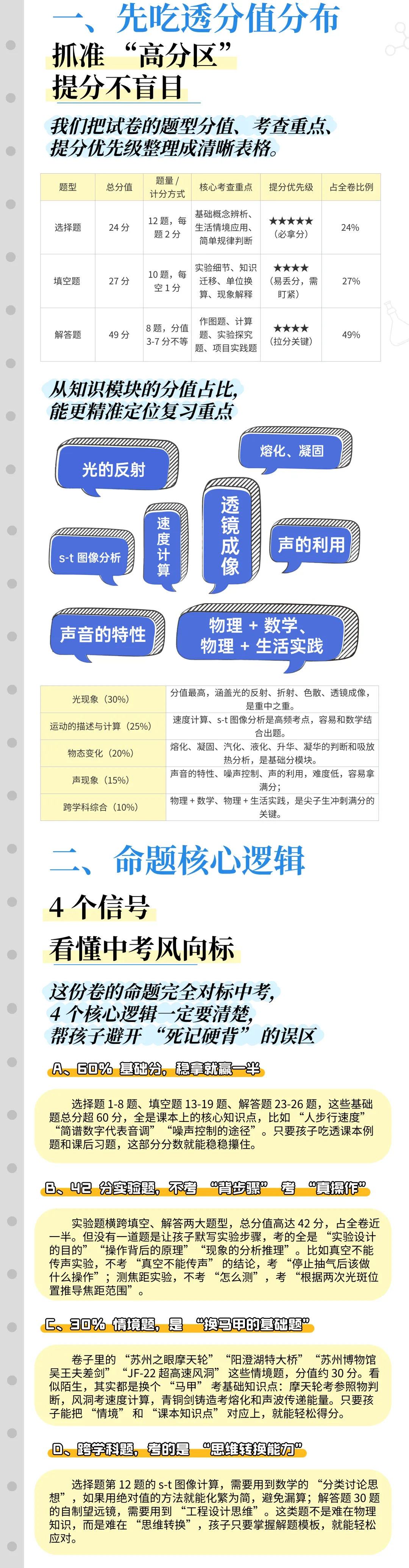 这份 2026 苏州八上物理期末统考卷,堪称八年级物理的 “精准提分指南”。它的分值分布清晰、考点紧扣课本,既不搞偏题怪题制造焦虑,又能准确测出孩子的知识短板。只要吃透这份卷的分值占比和考查逻辑,孩子后续的物理学习就能少走弯路,提分更高效。
