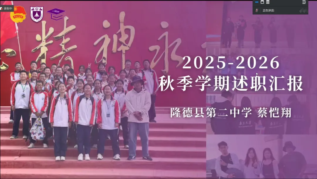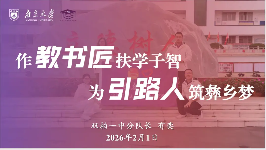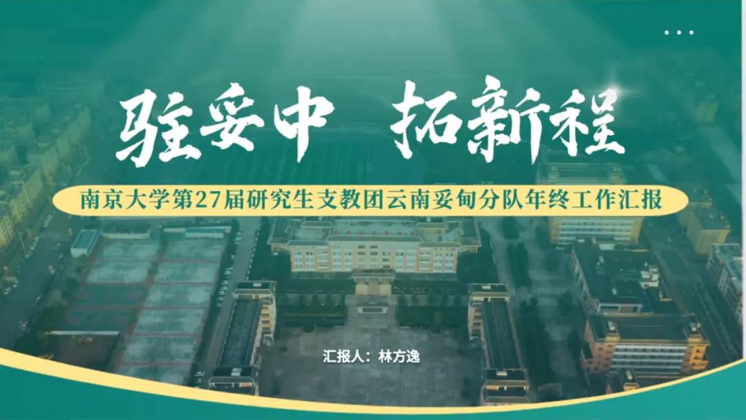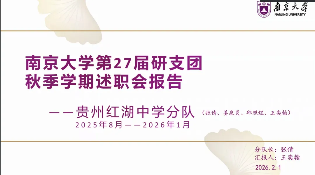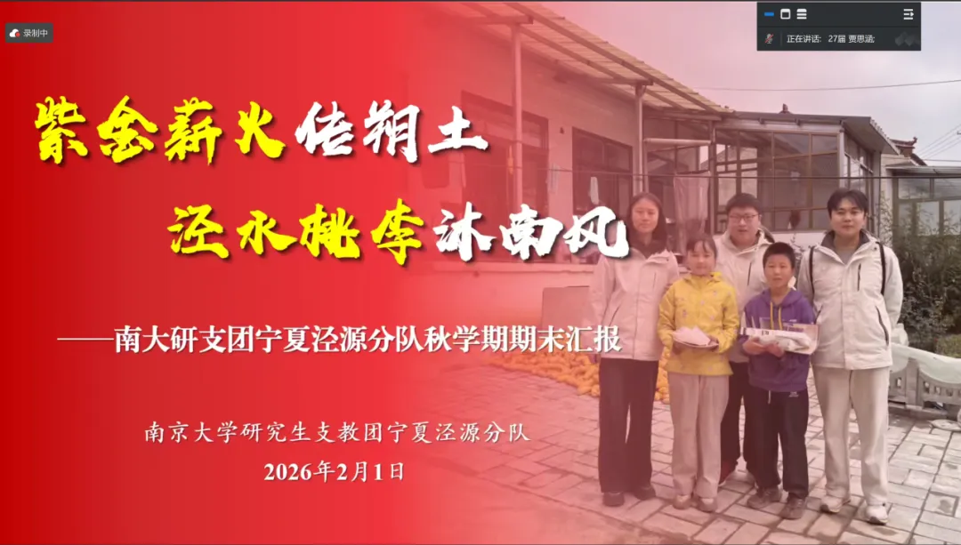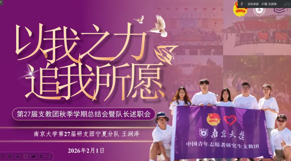 自2025年7月奔赴服务地以来,南京大学第27届研究生支教团全体成员牢记使命、扎根一线,积极投身于当地教育帮扶事业。在当地校领导、南京大学团委、项目办的领导下,成员们在深耕教学的同时,积极创新工作方法和活动内容,在思想引领、教育教学、第二课堂、校地联动、捐资助学等多个领域全面发力,以青春之力助力西部教育提质增效。2026年2月1日,第27届研究生支教团线上召开秋季学期总结会暨队长述职会,会议由西部计划项目办郭光蕊主持,校团委副书记王维嘉老师、校团委志愿服务部华晨老师出席本次会议,第28届研支团全体成员全程旁听学习。
