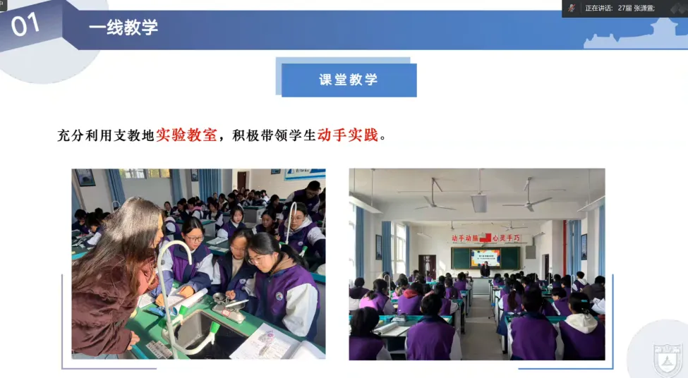 第27届研究生支教团团长宋泽宇进行服务工作情况回顾,他以“串联共振、五育并举”为核心关键词,全面回顾秋季学期工作。他提到,第27届研支团在出发前联动文科、社科、理工等多组团开展宣讲,通过教学大比武、出征仪式等筑牢团队凝聚力;抵达支教地后,依托四省七校联动优势,拓宽校地及高校间交流平台。在思想引领方面,支教团成员充分把握关键时间节点开展系列思想教育活动;科普教育领域,通过科创竞赛、无人机体验、AI 科普讲座等形式多点发力。此外,团队逐步推进研究性课题实践,共8个课题成功立项;同时建立月度队长会机制,加强各分队交流协作,筑牢工作根基。宋泽宇同学还分享了个人在云南双柏一中的教学工作,云南双柏团队通过不断优化教学方法,扎实创新第二课堂内容,在多个方面取得了突出成效。