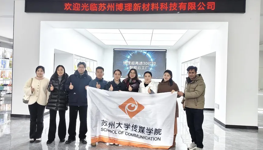 1月29日下午,受苏州纳米技术与纳米仿生研究所邀请,苏州大学传媒学院师生一行赴苏州博理新材料科技有限公司参观交流。双方围绕高速增材制造技术应用、文创产品开发与校企合作路径开展实地走访与座谈对接。传媒学院党委副书记、副院长丁姗,数字传播系系主任王国燕教授,团委书记王雁冰,以及程曦、林瀚等学院多名老师和硕博研究生共同前往调研交流。苏大出版社社长张健等一同应公司邀请参与了交流。