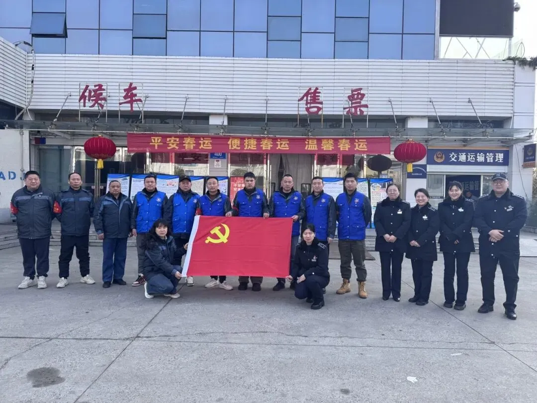 春运首日恰逢周一早高峰,六合客运公司在棠城广场南、北公交站开展志愿服务,为往来乘客送上暖心守护。