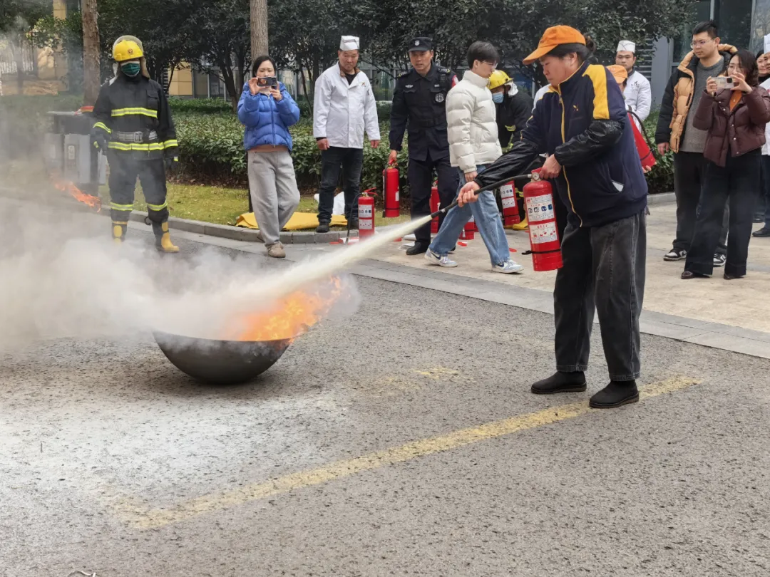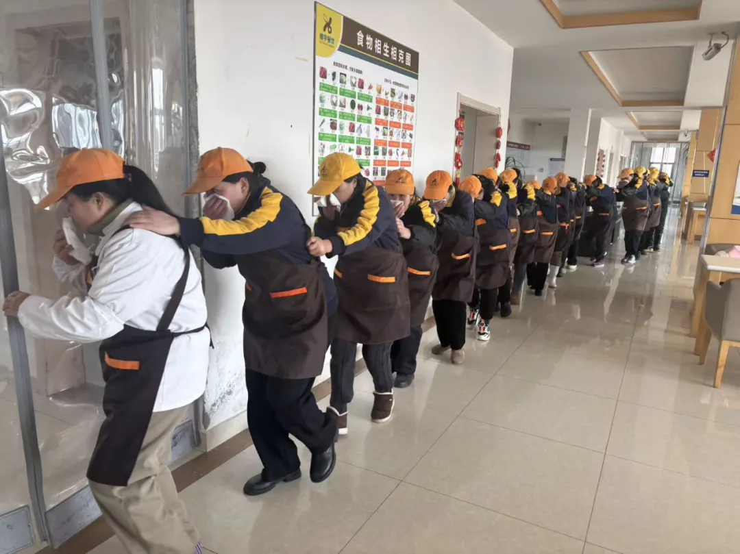 实操实训,提升应急处置技能。 演练模拟了后厨油锅起火真实场景。食堂工作人员按照预案,迅速实施“关阀断源、覆盖灭火、报警疏散”等一系列规范操作,同时安保科消防人员及时出动消防车,分组轮换练习了使用灭火毯、灭火器进行初期火灾扑救。整个过程反应迅速、操作规范、协同有序,有效检验了预案的可行性与员工的实战能力。