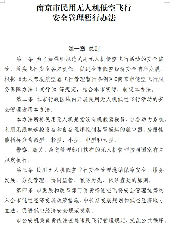 为引导广大飞行用户更好地“安全飞”,保障低空经济安全健康发展,近期,南京市交通运输局、市公安局、市发展和改革委员会等八个部门联合印发《南京市民用无人机低空飞行安全管理暂行办法》(以下简称《办法》),该办法将于2026年2月1日起正式施行,有效期至2028年1月31日。