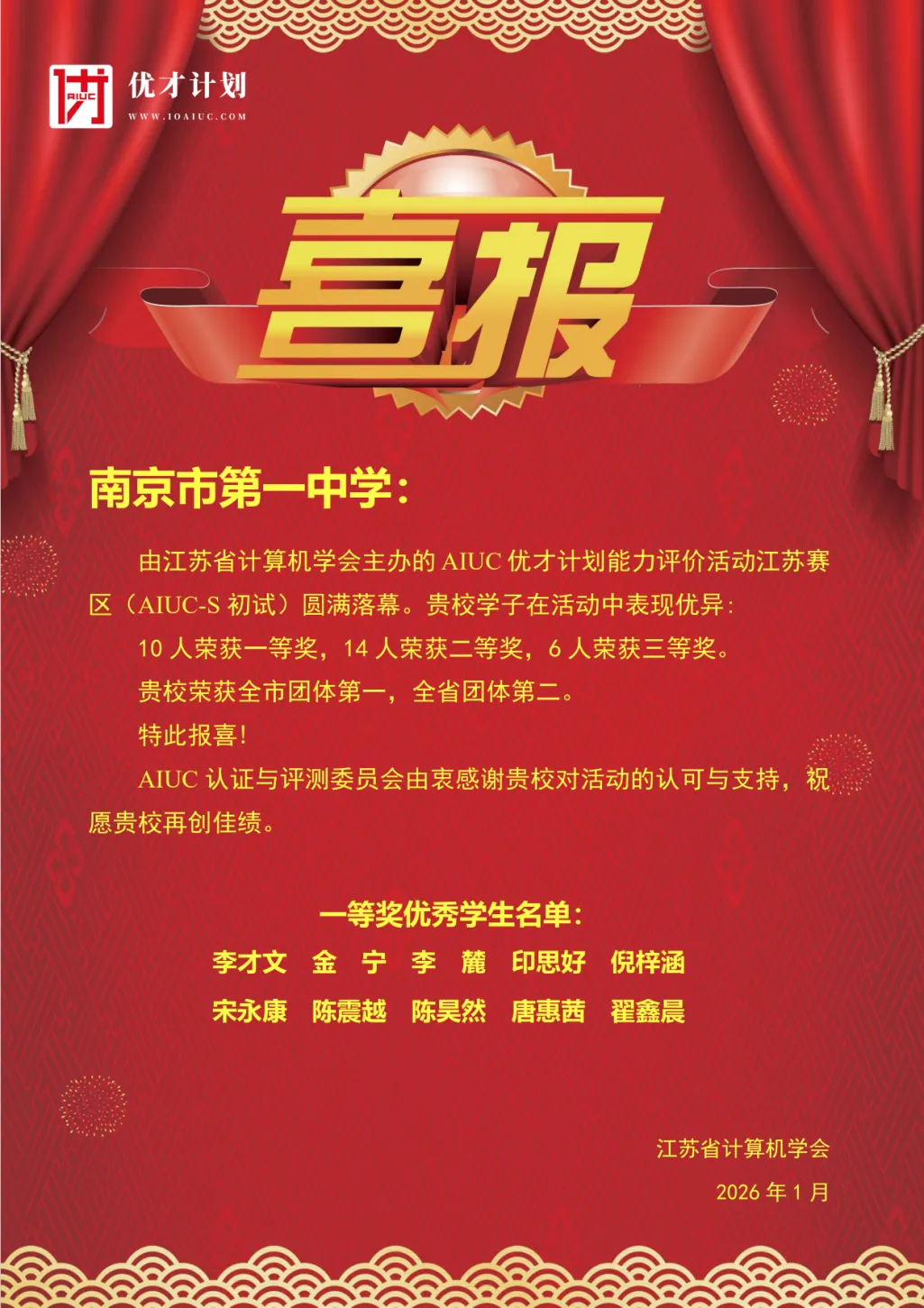 在由江苏省计算机学会主办的“AIUC优才计划能力评价(AIUC-S初试)”活动中,南京一中共有30名学子斩获奖项,同时荣获全市团体第一,全省团体第二!