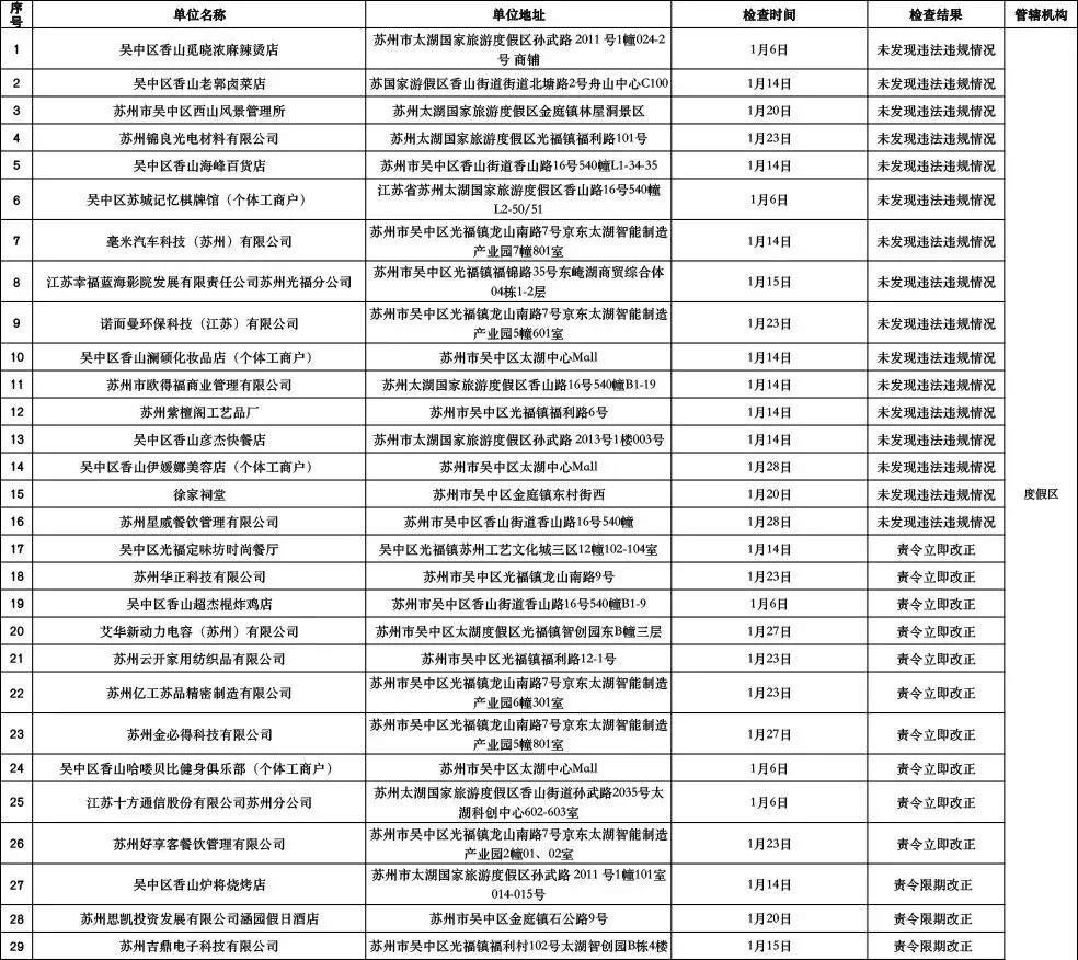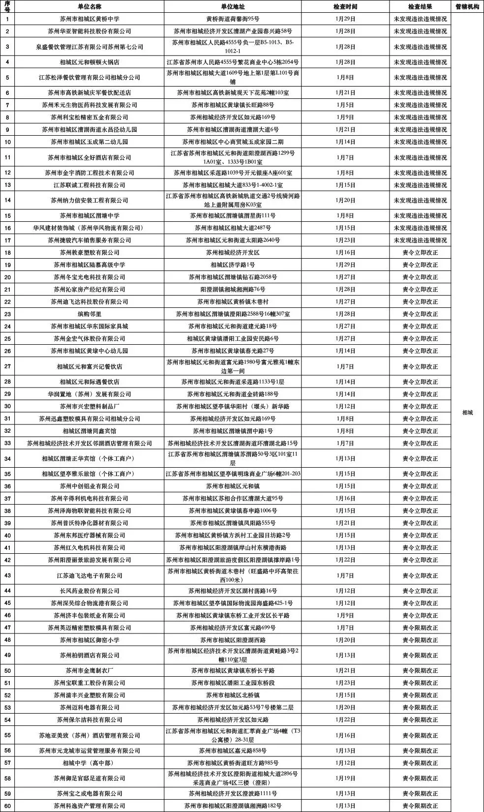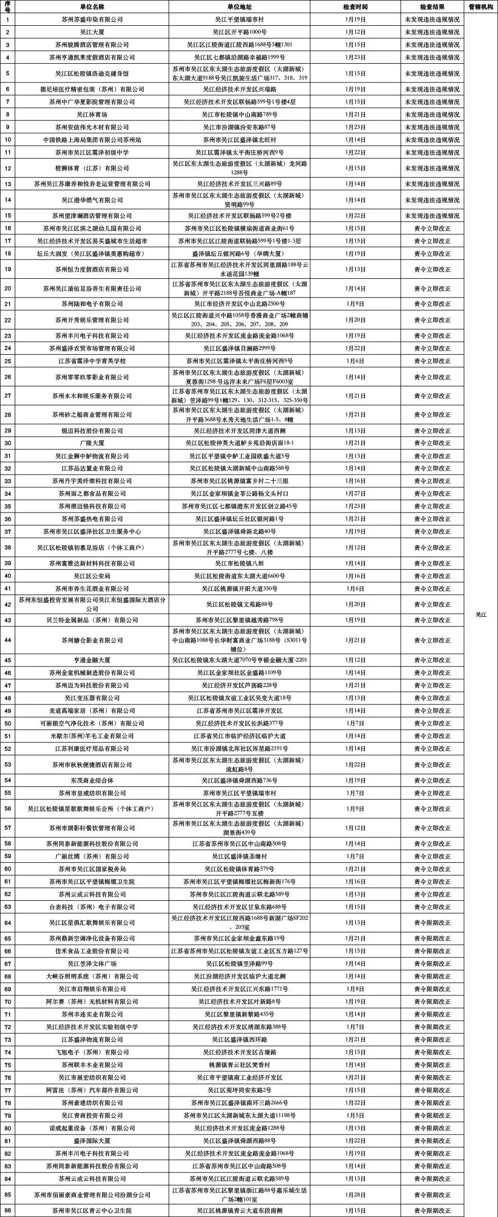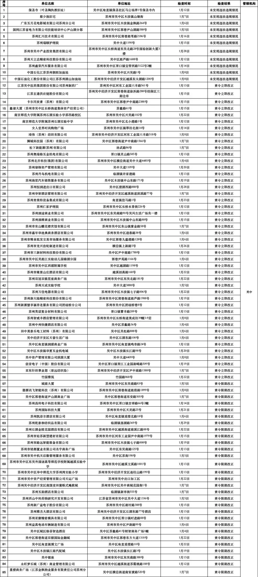 根据《中华人民共和国消防法》和应急管理部消防救援局《关于全面推行“双随机、一公开”消防监管工作的通知》的规定,苏州市消防救援支队决定对1月份抽查结果进行公示,请相关单位认真遵守消防法律法规,广泛运用“微消防”平台开展自查自纠,落实消防安全主体责任。