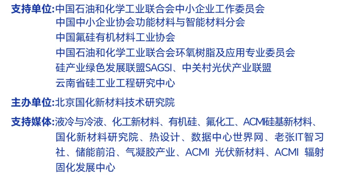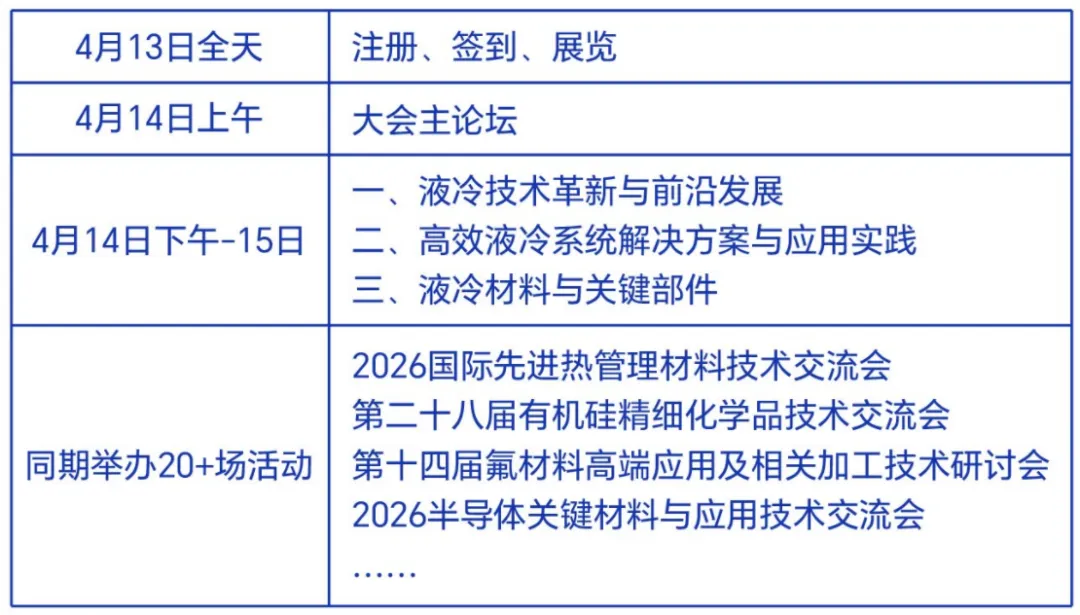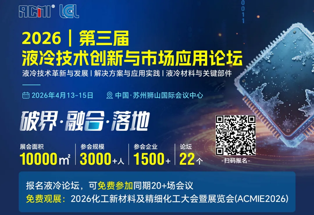 为推进液冷关键技术突破与产业应用落地,我院拟定于2026年4月13日至15日在苏州举办“2026(第三届)液冷技术创新与市场应用论坛”。本届论坛以“破界・融合・落地”为主题,将深入探讨液冷技术前沿趋势、系统级解决方案、关键材料与部件创新,以及典型场景的落地实践。同期同地举办“2026化工新材料及精细化工大会暨展览会(ACMIE2026)”,共设20场专题研讨会,涵盖能源新材料、半导体材料、热管理材料、液冷、氟材料、有机硅、辐射固化、电子胶、乙烯下游高端聚合物、特种工程塑料、丙烯酸及酯、甲基丙烯酸甲酯、高纯石英、气凝胶等重点方向。预计参会规模3000人,参加企业1500家、展示面积1万平米,一票通用。