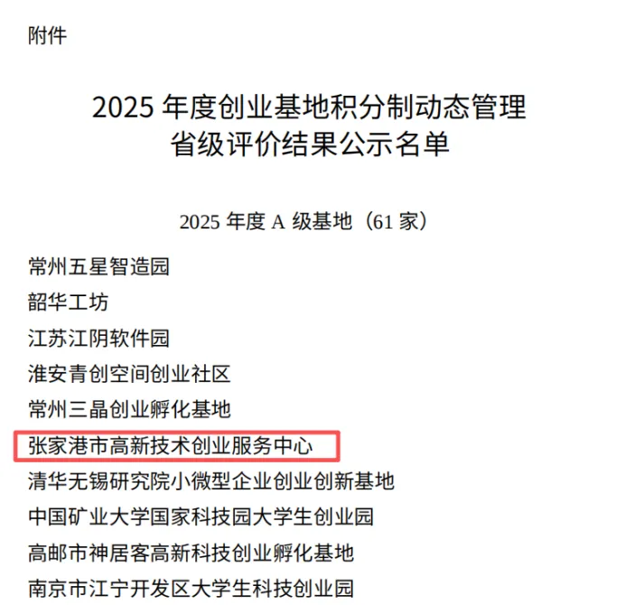 近日,江苏省人社厅公布2025年度创业基地积分制动态管理省级评价结果。本次评价围绕运营服务、孵化成效、带动就业等多维度量化评分,凸显“优奖劣汰”的动态管理导向,全省共61家基地上榜A级名单。其中,经开区(杨舍镇)的张家港市高新技术创业服务中心位列其中,为苏州市唯一获此等级的基地。