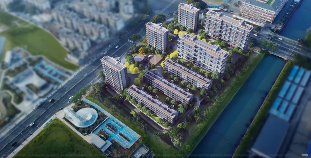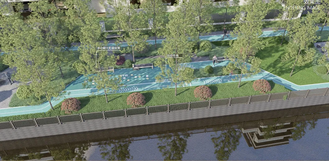 |项目效果图更难得的是,项目巧妙借景东侧古塘河,营造了约 2600㎡的滨水生活公园。晨跑、散步、亲子活动,下楼即享的公园生活,让自然真正成为日常的底色。