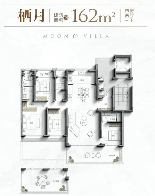 建面约162㎡户型:强调归家的仪式感与私密性,拥有独立电梯厅,约21㎡空中花园与约14.9米南向面宽,同样配备南向双套房,彰显沉稳大气的居家风范。
