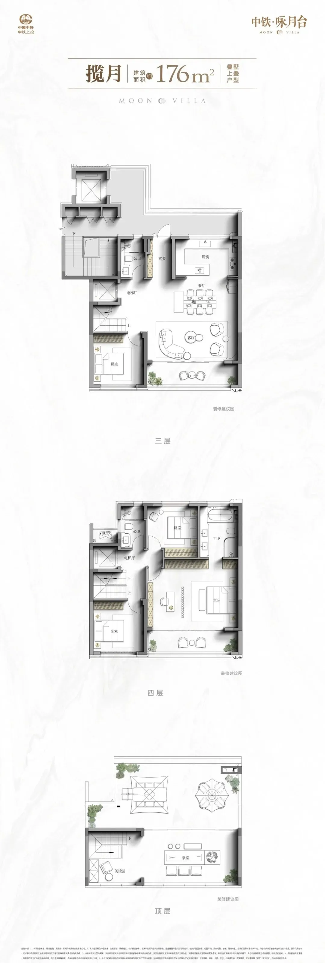 上叠(约176㎡):设计双露台系统,并赠送星空屋顶,在垂直空间里实现花园与星空自由。