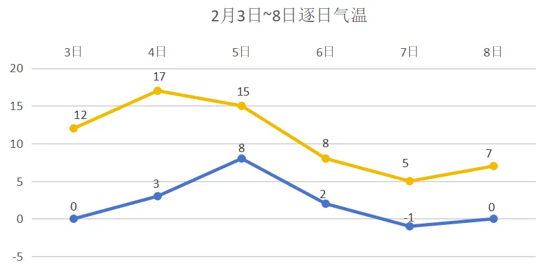 周内气温起伏较大,周前期气温明显回升,预计后天也就是立春当天,最高温度将达到17℃。6日起受冷空气影响,气温又将下降。周最低气温零下1℃左右,有薄冰,出现在7日早晨。