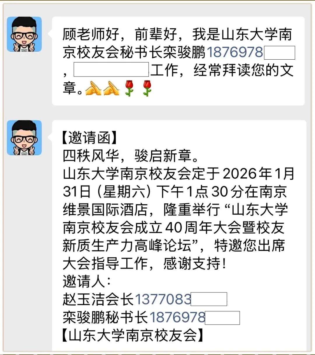 很荣幸,我也忝列其间,发来邀请的是山东大学南京校友会秘书长栾骏鹏。