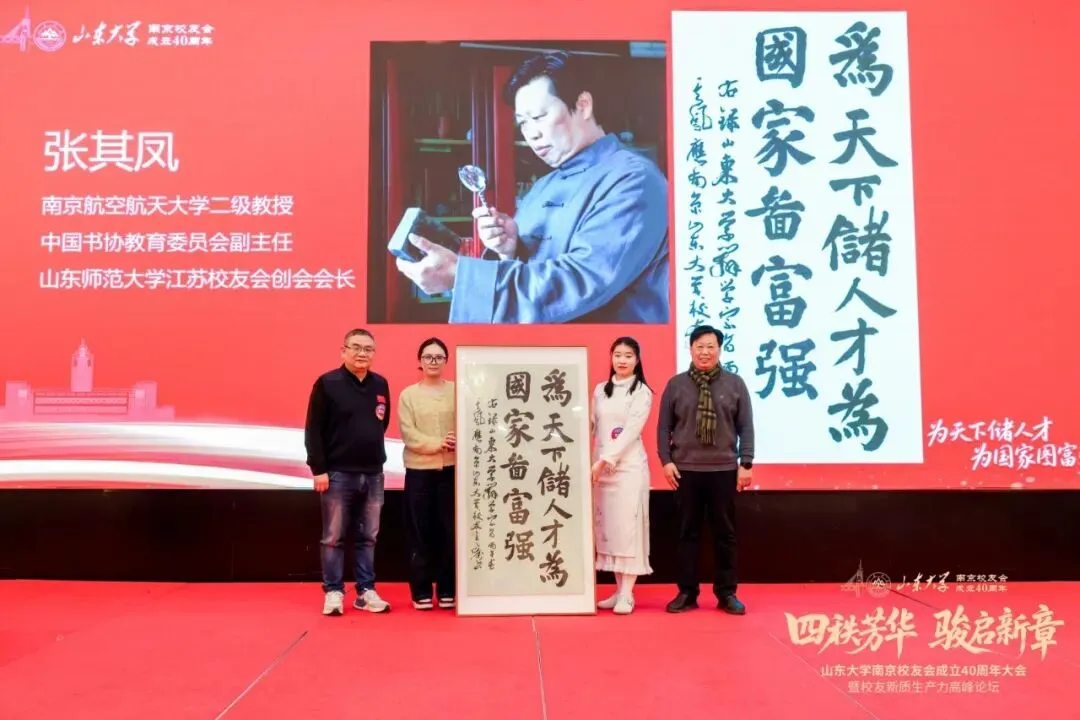 山东师范大学江苏校友会创会会长张其凤赠送上亲笔书法作品,上书山东大学办学宗旨:“为天下储人才,为国家图富强”。