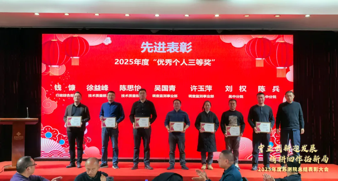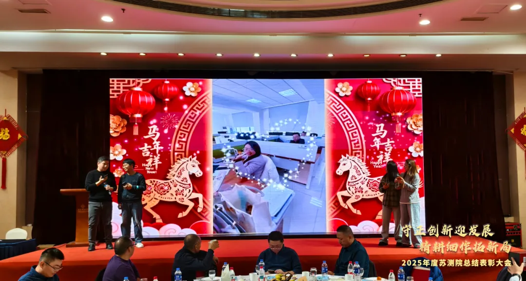 作为年会开篇的重要环节,2025年度工作回顾视频温情上线、备受关注。镜头流转间,每一组精准的坐标都凝结着突破的智慧,每一组鲜活的数据都镌刻着攻坚的汗水,每一项落地的成果都见证着苏测院的成长与担当。