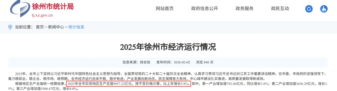 2026年2月2日,徐州市2025年GDP官宣了!根据