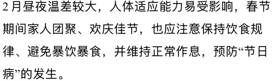 2月正值冬春交替之际,天气冷暖交织,又恰逢传统春节假期,人们返乡出游、走亲访友、聚会聚餐等各类聚集性活动显著增加,人员流动频繁,疾病输入及传播风险加大。