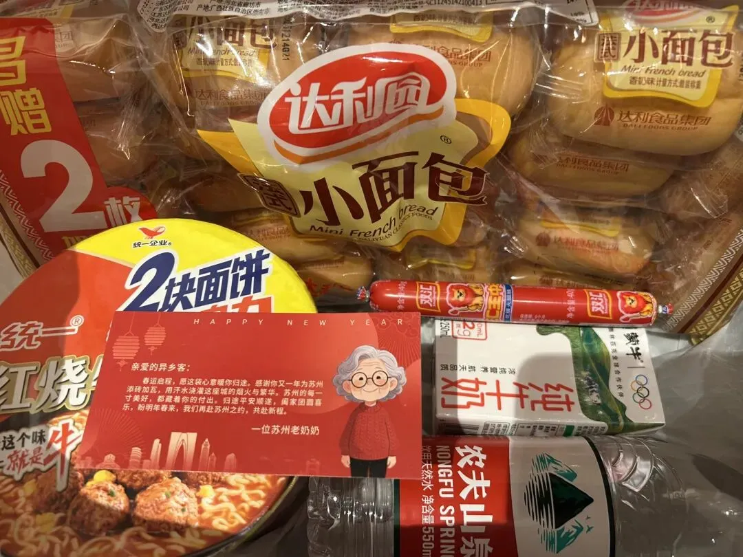 2月,第一个工作日,春运首日,又过苏州,再一次被温情感动。苏州火车站,志愿者们忙碌着向旅客发放食品,原以为是铁路或爱心企业营销宣传,既定“春运活动”罢了,听志愿者说,这是苏州一位老奶奶爱心赠送,大润发的购物袋,装着以下食品:(一)达利园法式小面包400克,(二)统一红烧牛肉面138克,(三)蒙牛纯牛奶250毫升,(四)农夫山泉550毫升,(五)双汇火腿肠40克。五种食品,一路温馨。比食品本身更让我感动的是一张红色贺年卡片,印着英文“HAPPY NEW YEAR”,还有老奶奶深情寄语。