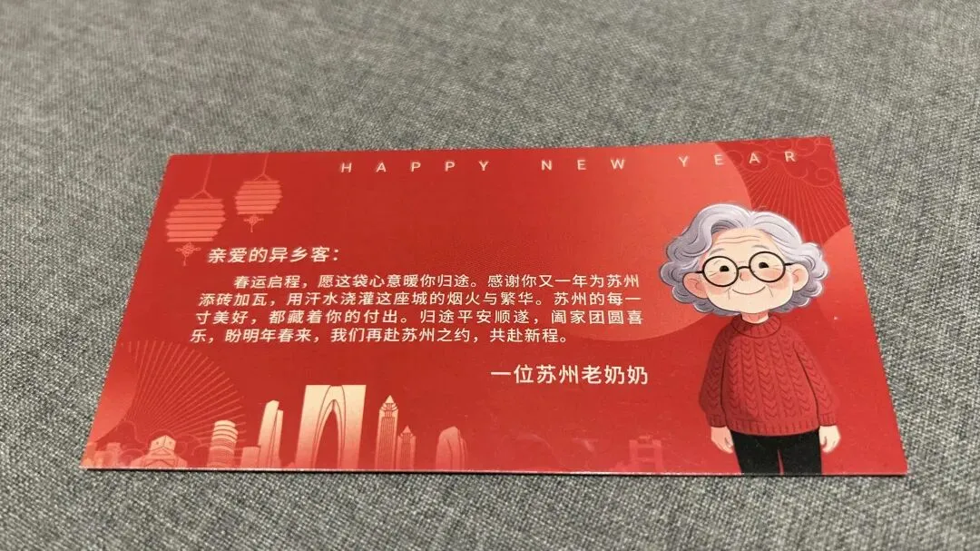 一位苏州老奶奶进站下电梯时候,看到卡片上这段话,那一瞬间,我的眼睛湿润了。能让我为之流泪的城市,除了老家之外,不多,但苏州算一个。当然,这不是第一次被苏州感动。老家人常说,东西不在多少,心意,有心就管。一路上,我在想,过去的2025年,逆境中前行,一次次都是苏州,赋予我无穷的力量。盘点2025年,来回穿梭,在苏州日子,到访次数超过70天。日久生情,怎能不爱这座城市呢?这些年,南方所有城市中,苏州,亲爱的苏州,依然是仅次于南京的最爱,喜欢这里的春夏秋冬,清晨夜暮。环顾古城区,从平门到乐桥,从平江路到山塘街,吴侬软语里,每一条斑驳的小巷,每一处精致的园林,每一家书店的灯光,都留下我青春的脚印,这座城市,恰如我的精神原乡。几回回,一瓶沙洲优黄,半斤藏书羊肉,让我沉醉在姑苏之夜,那时,我还会想起老家,想起汇源油条辣汤。春运路上,温情苏州。风雨这一年,逆境求生,冬去春来,谢谢亲爱的苏州,谢谢可敬可佩的苏州老奶奶。作为旅客和过客,我会把这袋心意和温暖带回家,来年春天,也会再赴苏州之约,继续逐梦江南。曾一度刷屏的流行语“你永远可以相信苏州”,彰显了“一哥”,优等生城市的担当和作为。苏州统计刚刚出炉数据,2025年全市实现地区生产总值27695.1亿元,又是当之无愧的“苏大强”。
