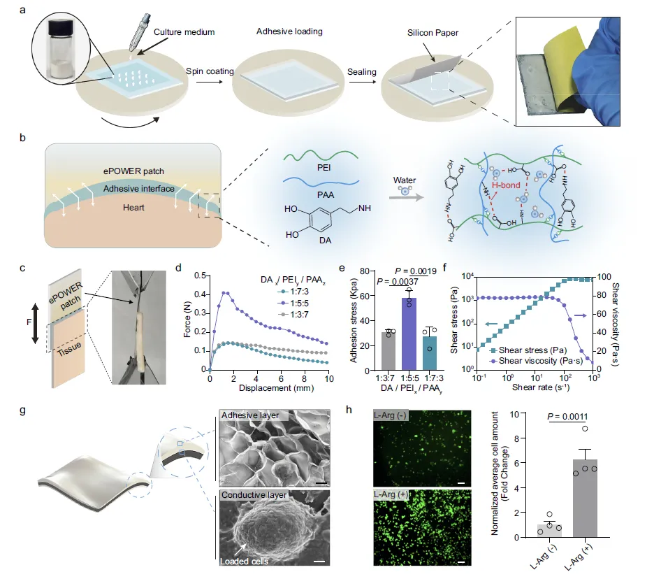 此图聚焦于 ePOWER 贴片关键组成部分 —— 黏附层的制备、力学性能及生物相容性。a 图描述了黏附层的制备流程,通过冻干法制备 DA/PEI/PAA 粉末,经旋涂均匀分布于贴片表面,并用硅油纸保护以防止水分蒸发;b 图解释了黏附层的黏附机制,由 PEI 与 PAA 形成物理交联框架,多巴胺通过分子间作用力进一步强化黏附网络;c 图展示了搭接剪切试验的示意图与实物图,用于评估黏附强度;d、e 图通过实验数据确定了 DA/PEI/PAA 的最优质量比为 1:5:5,此时黏附应力可达 58KPa,且 zeta 电位和 pH 值利于维持交联密度与低细胞毒性;f 图表明该黏附剂在动态剪切条件下仍保持高黏度(约 78 Pa・s)和低流动性,适配心脏跳动的动态环境;g、h 图显示,导电层经 L - 精氨酸修饰后,能有效支持细胞生长且无明显细胞毒性,同时黏附层的微米级孔隙结构便于 EV 释放,为贴片的体内应用提供了生物相容性保障。