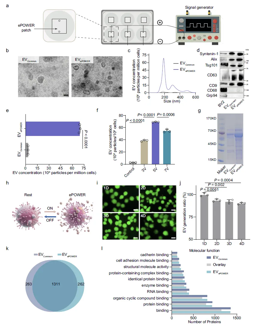 该图通过一系列实验验证了 ePOWER 系统在 EV 生产中的优势。a 图展示了 EV 生产的实验装置,BV2 巨噬细胞接种于 ePOWER 贴片后接受电刺激;b 图通过 TEM 观察到,EVePOWER 与常规培养产生的 EVCommon 均呈典型杯状结构,尺寸约 200 nm,形态完整;c 图通过 NTA 定量分析证实 ePOWER 刺激显著提升 EV 浓度;d 图 Western Blot 结果显示,两种 EV 均表达 CD63、Alix、CD9 等典型 EV 标志物,表明 ePOWER 刺激未改变 EV 的核心特征;e 图数据显示,经电刺激后单个细胞的 EV 产量较对照组提升约 24 倍;f 图确定了最优电刺激参数为 5 V、20 分钟,此条件下细胞无明显损伤且 EV 产量最高;g 图 SDS-PAGE 分析表明 EVePOWER 的蛋白信号更强,提示其浓度更高;h-j 图证实 ePOWER 系统可重复稳定产生 EV,连续 4 天刺激后 EV 产量仍保持在 80% 以上;k、l 图通过蛋白质组学分析发现,EVePOWER 与 EVCommon 共享 1311 种相同蛋白,分子功能相近,进一步证明 ePOWER 产生的 EV 具备与天然 EV 一致的生物特性。