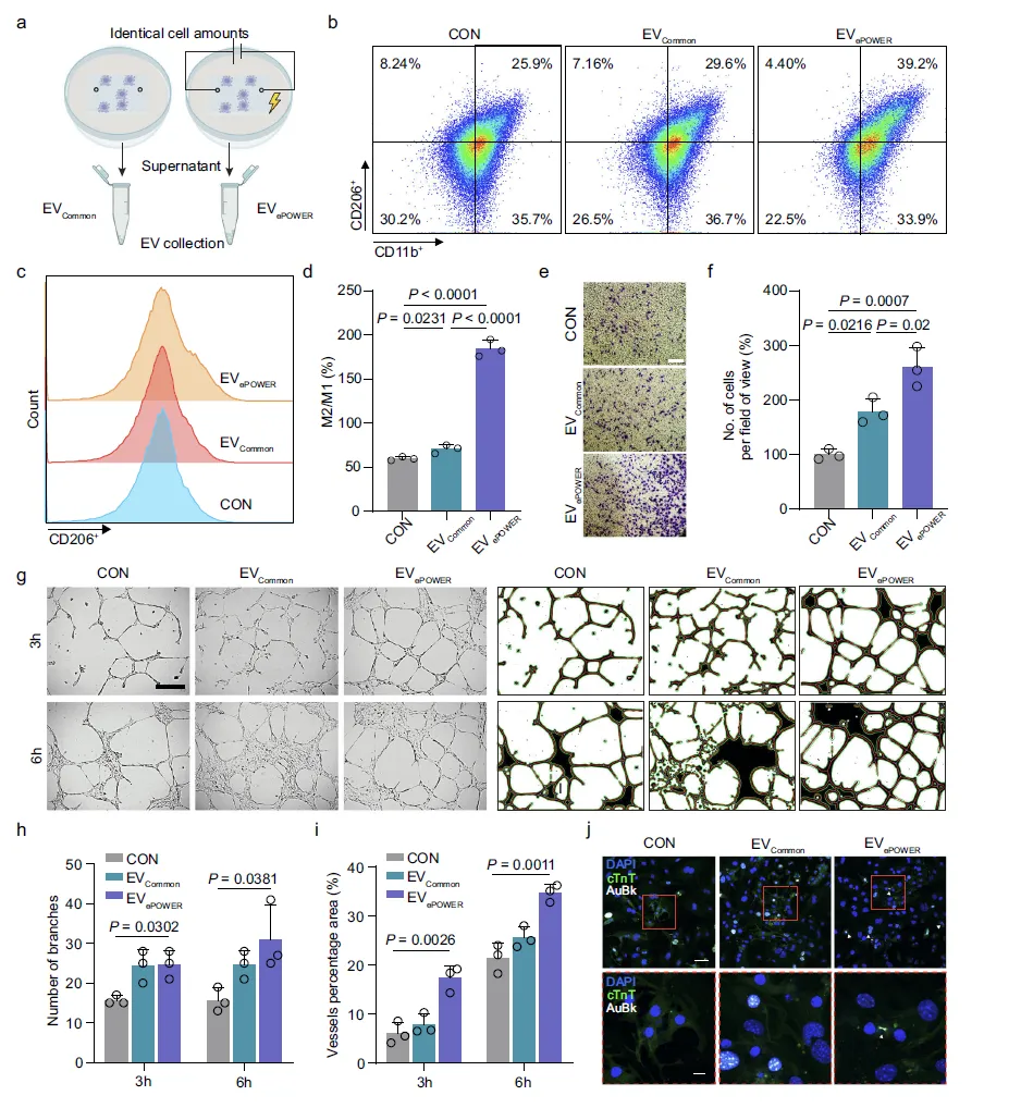 该图通过体外实验评估了 ePOWER 产生的 EV 在心梗修复相关过程中的功能。a 图示意了 EVCommon 与 EVePOWER 的收集方式,确保两种 EV 来自同等数量的细胞,以保证实验对比的公平性;b-d 图通过流式细胞术检测 M2 型标志物 CD206 的表达,发现 EVePOWER 能更有效地促进心梗部位巨噬细胞从 M1 型向 M2 型极化,且 M2/M1 比值显著高于 EVCommon 组,同时提升抗炎因子 IL-10 的表达,降低促炎因子 TNF-α、IL-1β 等的水平;e、f 图 Transwell 迁移实验表明,EVePOWER 处理组的 HUVEC 迁移能力显著增强;划痕实验进一步证实 EVePOWER 对内皮细胞迁移的促进作用更优;g-i 图管形成实验显示,EVePOWER 能诱导 HUVEC 形成更多、更复杂的毛细血管样结构,且该效应随时间推移(3h 至 6h)更为明显,总血管长度、血管面积占比和连接点数均优于对照组;j、k 图通过免疫荧光染色检测心肌肌钙蛋白 T 和 Aurora B 的表达,证实 EVePOWER 可显著促进心肌细胞增殖,且效果优于 EVCommon,为心梗后的心肌修复提供了功能基础。