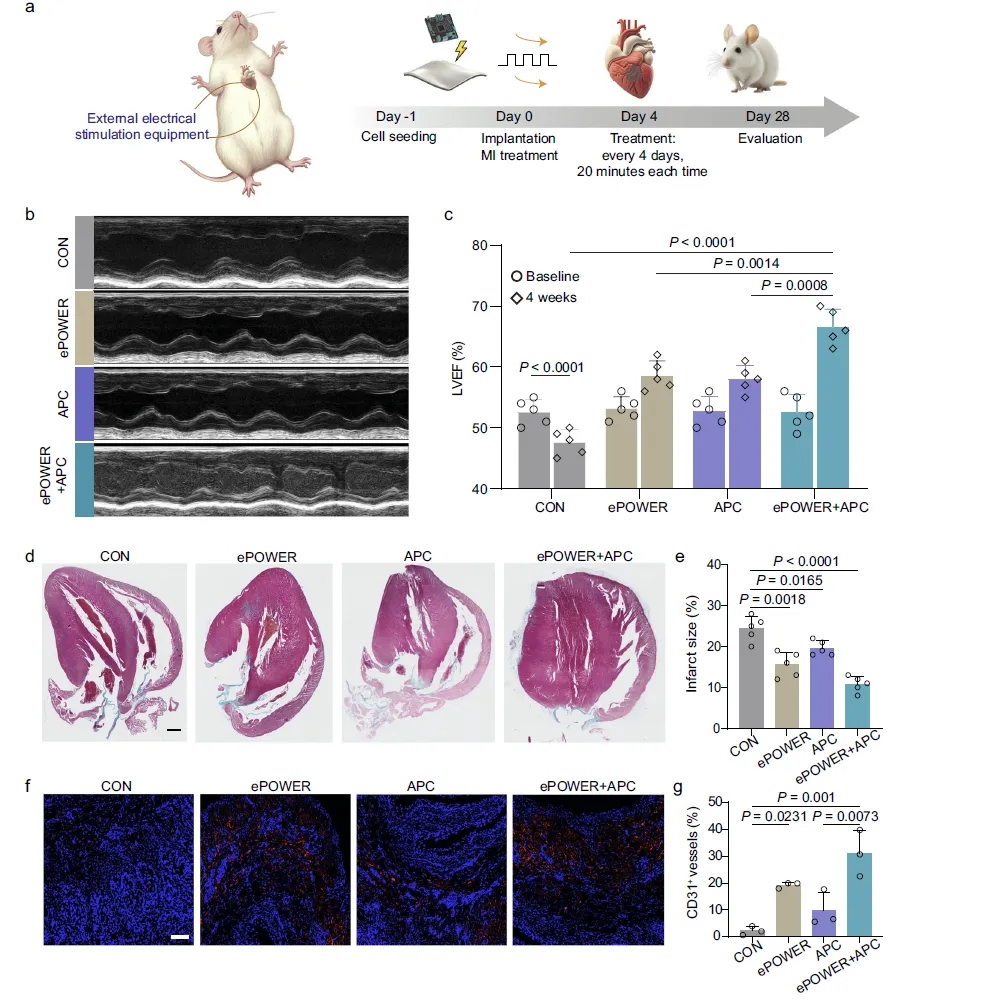 此图呈现了 ePOWER 系统体内治疗心梗的关键实验结果。a 图展示了研究设计流程,大鼠心梗模型建立后植入 ePOWER 贴片,设置对照组、ePOWER 组、阿司匹林组及联合治疗组,每 4 天进行一次电刺激,28 天后评估治疗效果;b、c 图超声心动图结果显示,对照组大鼠左心室射血分数(LVEF)显著下降,前壁运动幅度减弱,而 ePOWER 组和阿司匹林组均有改善,联合治疗组的 LVEF 提升最为显著,心脏功能恢复最佳;d、e 图 Masson 三色染色结果表明,对照组梗死区域纤维化严重,而 ePOWER 组和阿司匹林组的梗死面积明显缩小,联合治疗组梗死面积仅约 10%,纤维化程度最低;f、g 图通过 CD31 免疫染色发现,ePOWER 组的血管新生数量显著高于对照组,联合阿司匹林治疗后血管新生进一步增强,为梗死区域的血液供应恢复提供了保障,整体实验证实 ePOWER 系统可有效改善心梗大鼠的心脏功能,缩小梗死面积,且与阿司匹林联合使用效果更佳。