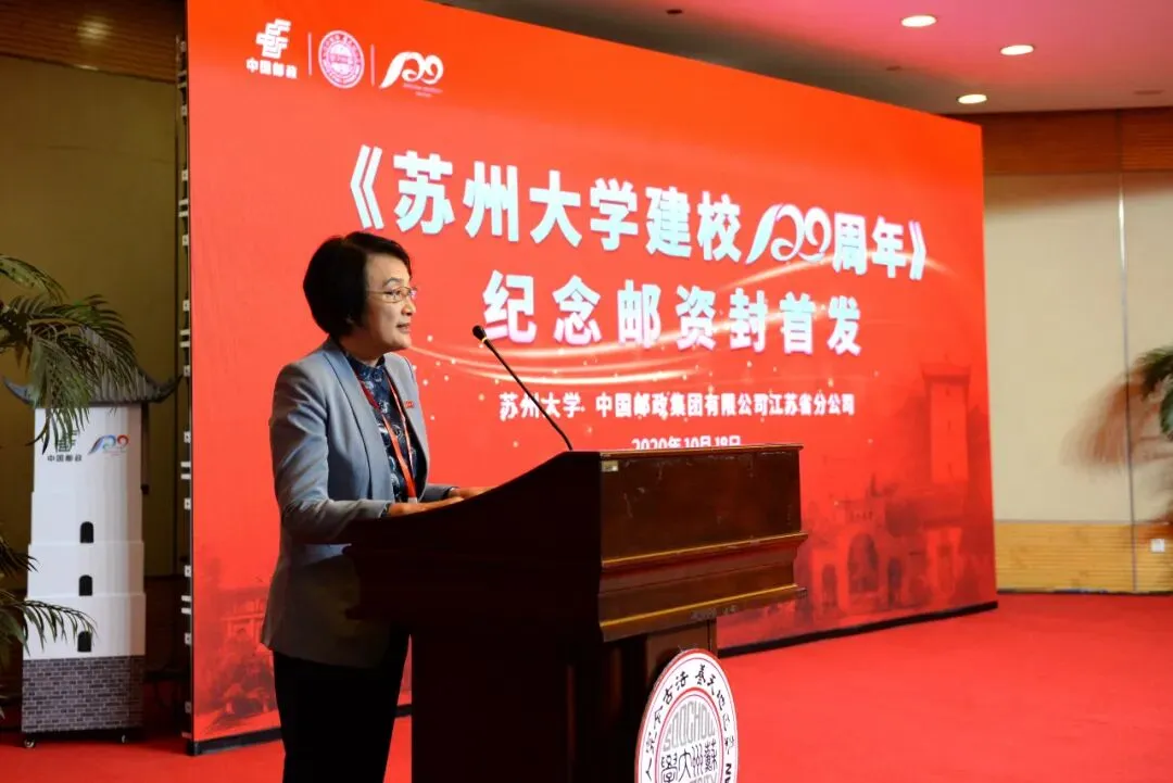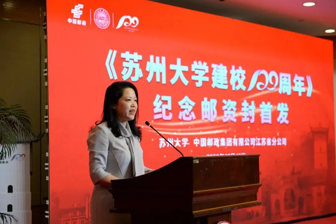 仪式伊始,蒋星红副校长致辞。她指出,建校120周年纪念邮资信封等邮品将有助于更多的人关注苏大的发展与建设,扩大学校的办学深意,既体现了苏大光辉传统,也展示了苏州大学向世界一流大学迈进的崭新风貌,传递出苏大“养天地正气,法古今完人”的校训精神。