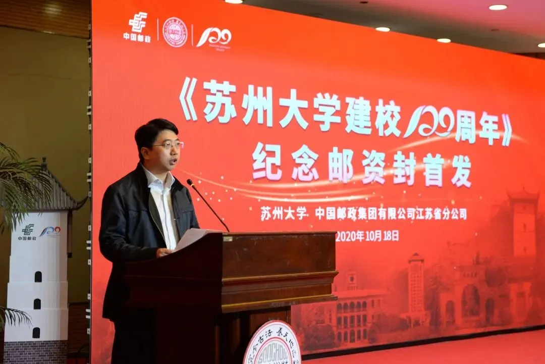 中国邮政集团有限公司江苏省分公司朱明华副总经理在致辞中向苏州大学建校120周年表示祝贺。他指出,江苏邮政愿以邮文化的魅力,与苏州大学携手同行,为双方友谊合作开启新篇章。