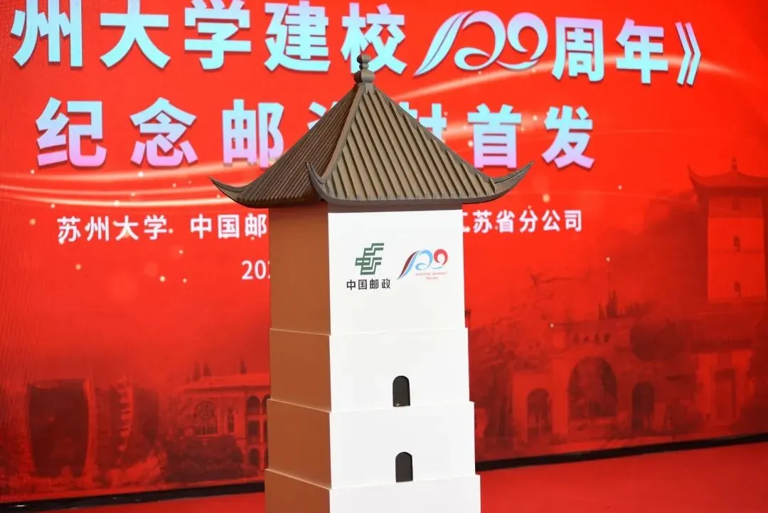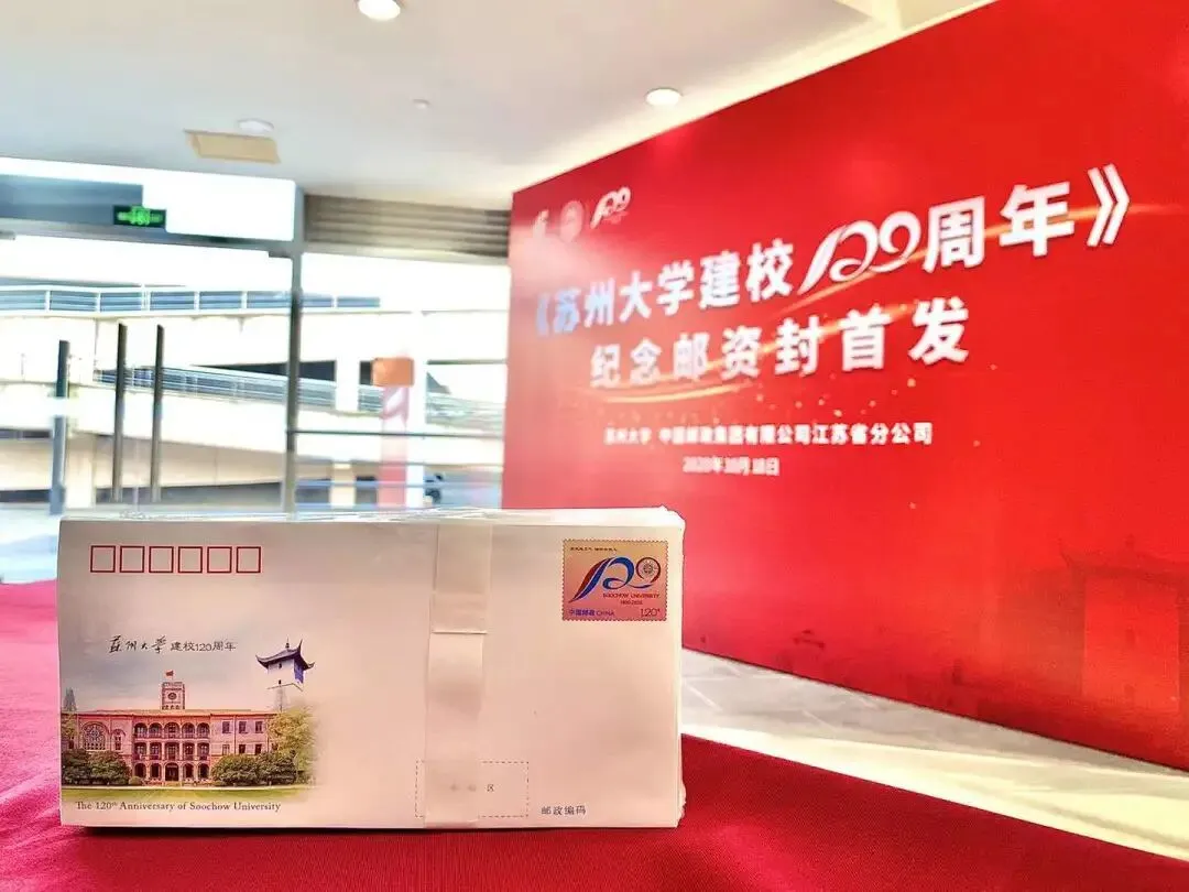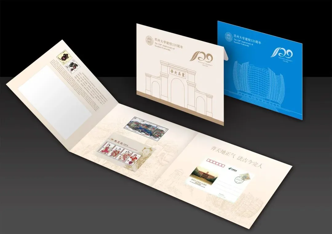 《苏州大学建校120周年》纪念邮资封主要画面由苏州大学钟楼和文星阁组成,图案周围分别印有“苏州大学建校120周年”中英文字样,邮资图设计则脱胎于苏州大学建校120周年LOGO,整体设计精致,苏韵十足。