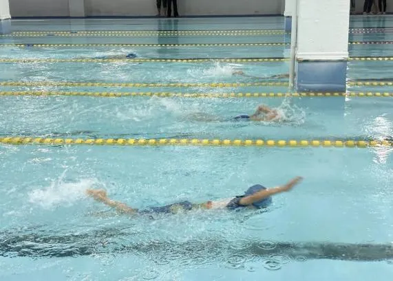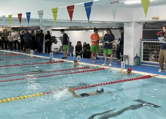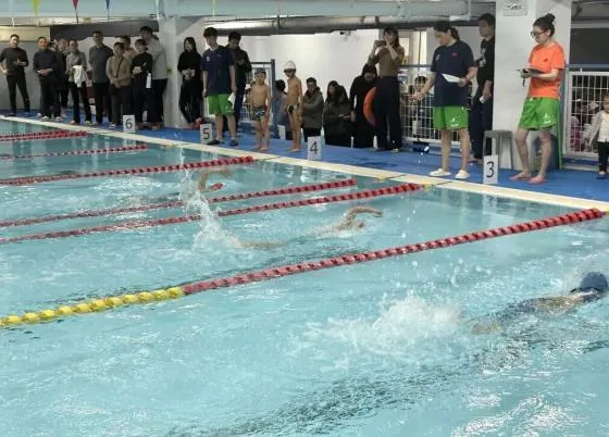 8时30分,随着发令枪声响起,游泳比赛正式拉开帷幕。比赛按自由泳、仰泳、蛙泳、蝶泳四个项目依次展开,并依据年级分组进行。池边,家长们手持相机,为孩子们加油助威;池中,学员们劈波斩浪、奋勇争先。尽管部分低年级学员因训练时间较短或经验不足一度落后,但他们未言放弃,在教练、队友和家长的鼓励下坚持游完全程,赢得了全场掌声。