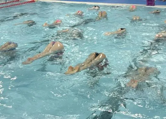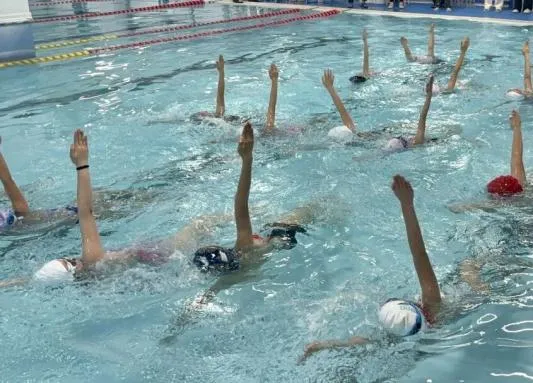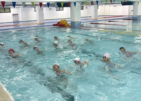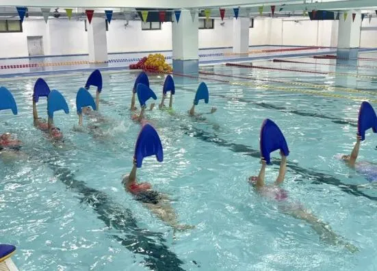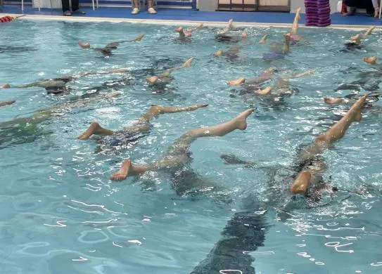 10时整,花样游泳展示环节开启。小队员们身着彩衣,以整齐划一的动作在水中翩翩起舞,时而如海豚跃动,时而如花瓣舒展,将柔美与力量完美结合。家长们纷纷感慨,孩子们的协调性和表现力进步太大了!