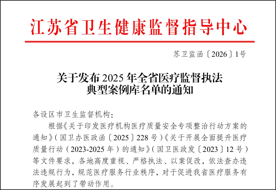 近日,江苏省卫生健康监督指导中心公布2025年全省医疗监督执法典型案例库名单,在全部70个案例中,苏州市共有10个案例入选。