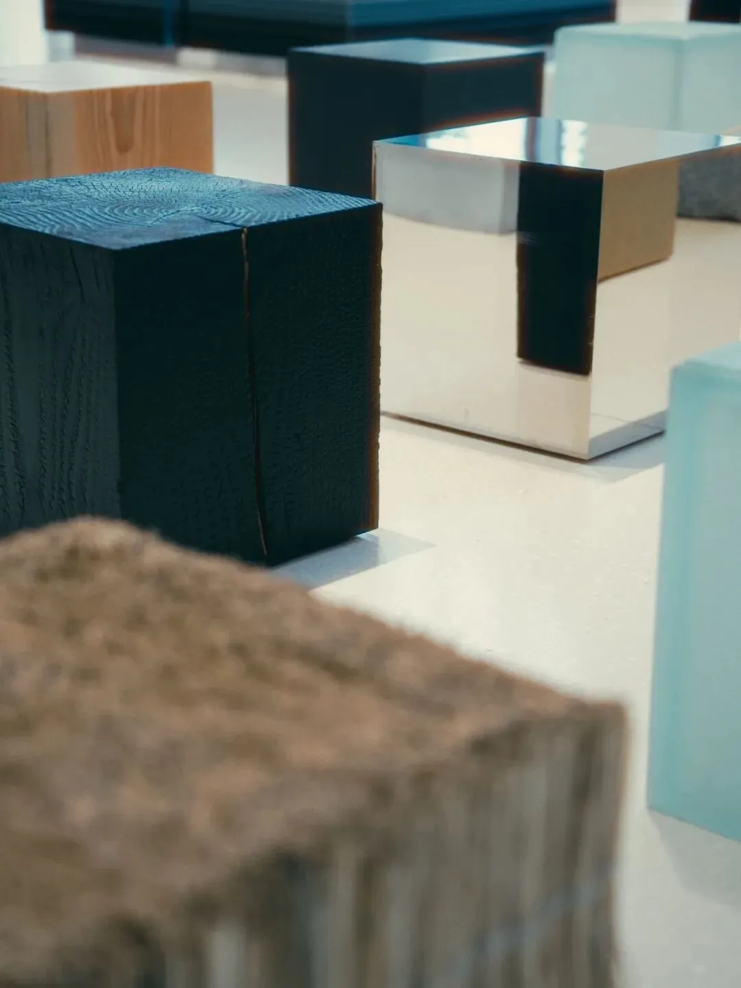 此外,展厅里还特别用十种建筑材料制作了十个外形一摸一样的正方体坐凳,舍弃了一切的设计元素,让你直观感受到十种材质的同与不同,无声传递出整个艺术展的核心疑问——