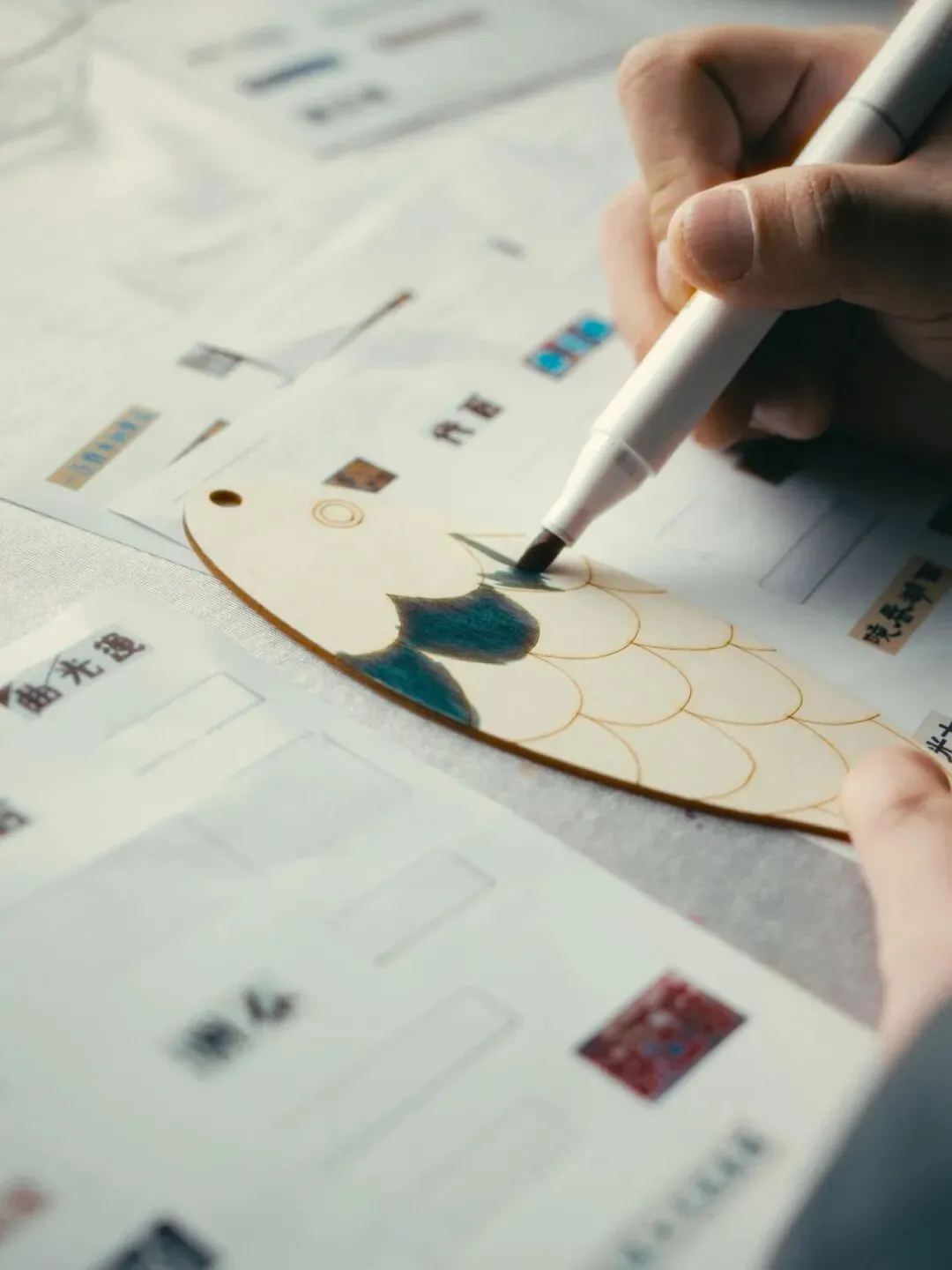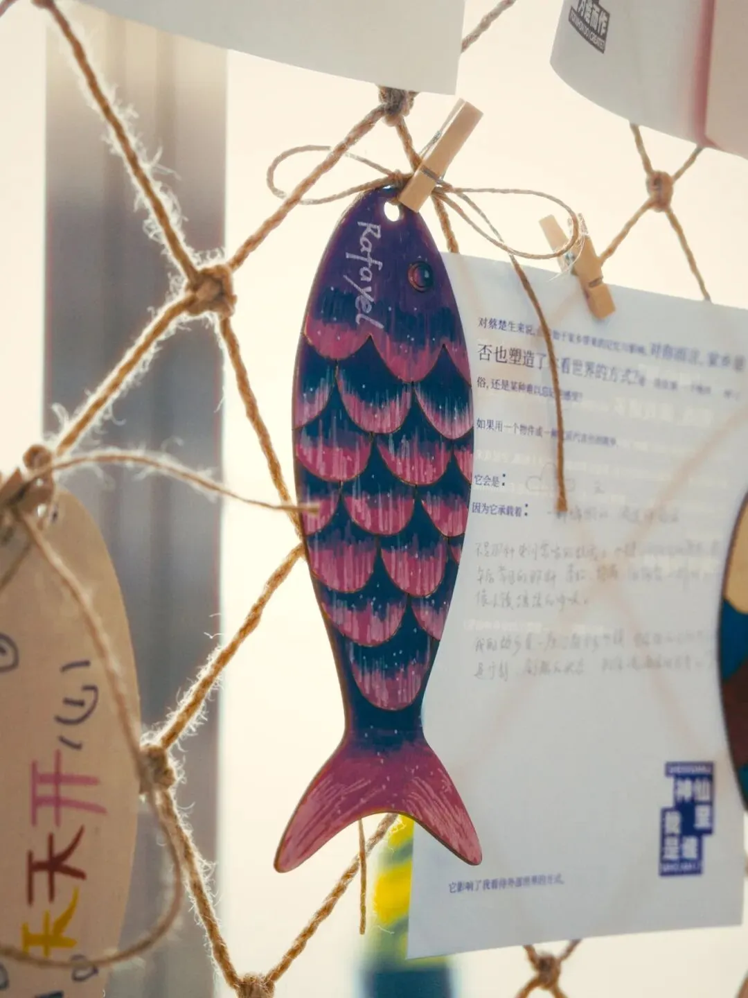 在展览的最后,还有一个与“渔光曲”呼应的互动体验玩法——亲手为小鱼木板绘画上色,或抽象或写实,再挂到渔网上,和其他小鱼一起摇曳,形成另一种意义上的“渔光曲”。