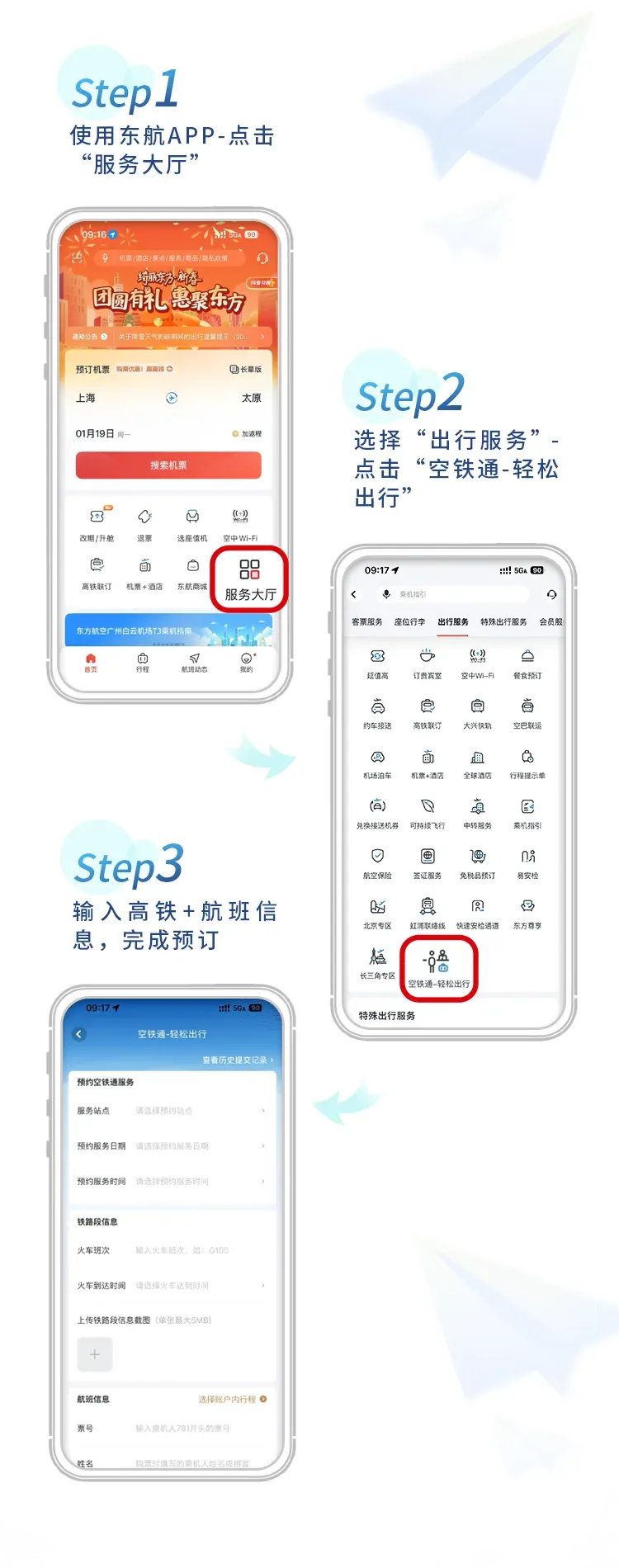 预约完成后,在出行当日前往位于高铁苏州北站的服务站点(12306服务台)提前办理好航班值机、行李托运、领取登机牌(行李将通过智能系统精准分拣、无缝转运),到达机场后无需重复值机+托运行李,可直接通过安检进入候机区。(*详情请咨询服务站点东航工作人员)