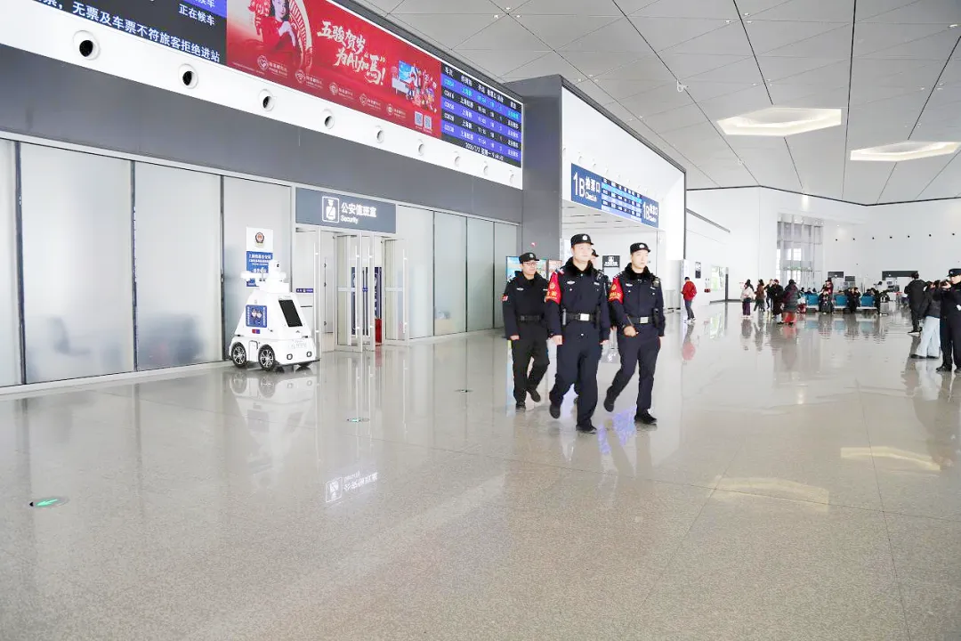 热闹的候车大厅里,安全防线始终在线。为应对春运客流高峰,苏州南站派出所动态调整警力部署,增设钉子岗、机动巡逻岗、勤务岗,全力守护旅客平安出行。与此同时,机器人巡逻车凭借着“全方位监控”“全时段巡逻”“全覆盖宣传”的优势,成为春运安保的“新力量”。