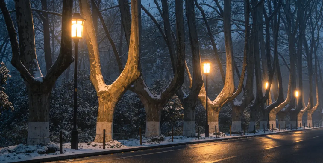 我抬眼望过去,路两旁的法国梧桐光秃秃地立着,遒劲的枝桠赤裸地伸向灰蓝色的天空,像一幅疏朗的水墨画。冬日的风掠过枝桠,带起细碎的呼啸,却一点不觉得萧瑟 —— 反倒想起春夏时,这些枝桠上挂满浓密的绿荫,遮天蔽日地笼着整条街的阴凉。我忍不住轻叹一声,声音里裹着藏不住的喜欢:“说真的,我太爱南京的法国梧桐了。”