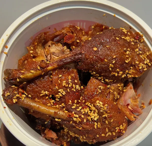 我们仨边撸串边啃鸭,香酥鸭的脆、烤香鸭的嫩,配上徐州烧烤的烟火气,竟意外地合拍。梧桐看着我们停不下来的筷子,笑得眉眼弯弯:“在南京吃烧烤,配上天府烤卤的鸭,才是地道的混搭快乐!” 果然,这提前预定的美味,成了这顿晚餐最惊喜的加餐,也让南京的烟火滋味,多了几分卤香缭绕的记忆。