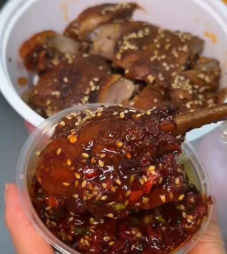先看那烤香鸭,色泽红润油亮,带着炭火烤制的焦香。肉质比香酥鸭更紧实些,撕开来能看到纹理分明的瘦肉,却一点不柴。“它是先卤后烤的,卤香打底,烤香升华,” 梧桐说着蘸了点秘制酱汁,“蘸这个吃更绝!” 酱汁带着微辣的鲜香,裹着鸭肉入口,卤味、烤香和酱汁的风味层层叠加,越嚼越有滋味,连骨头都忍不住嚼碎吞下,满是咸香。